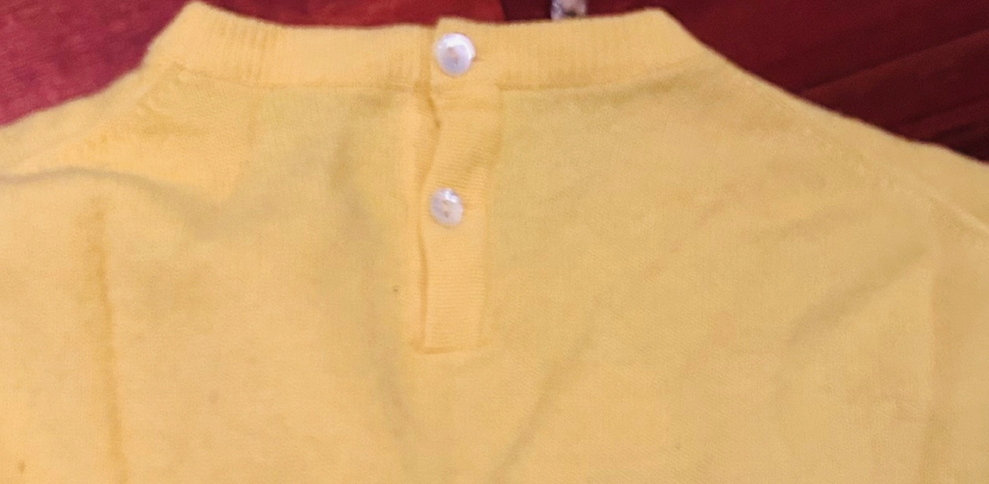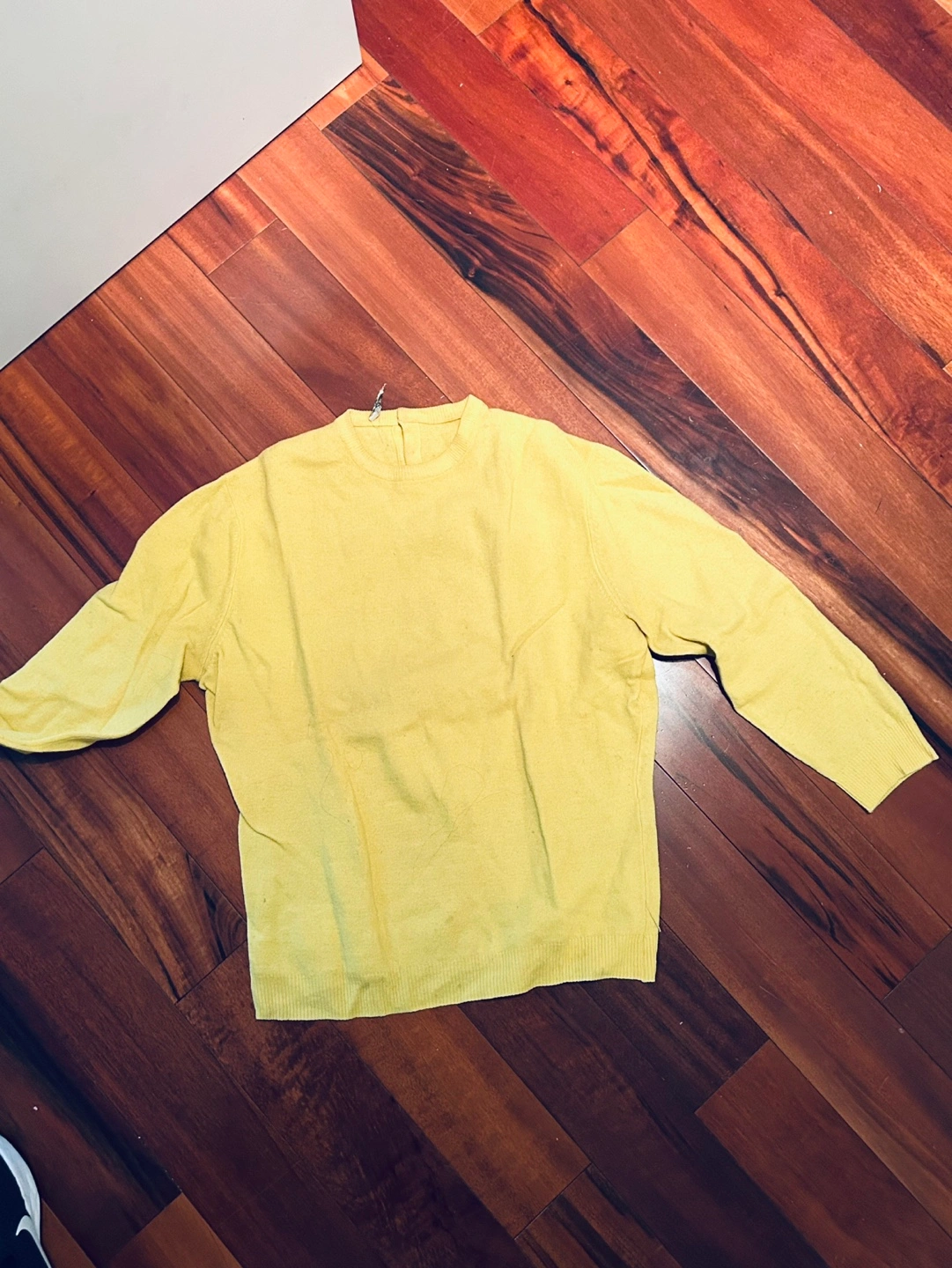 10Yellow long sleeve 100% wool sweater with button detail on the back.