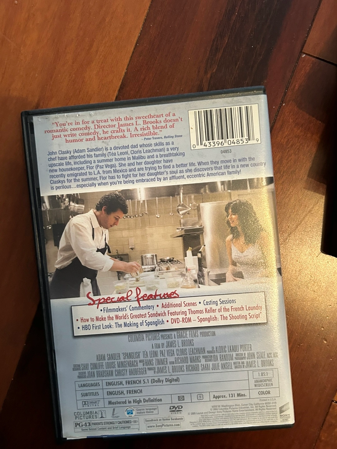 DVD includes special features: commentary, additional scenes, casting sessions, How to Make the World's Greatest Sandwich, Featuring Thomas Keller of the French Laundry, HBO First Look, The Making of Spanglish, DVD-ROM, The Shooting Script.