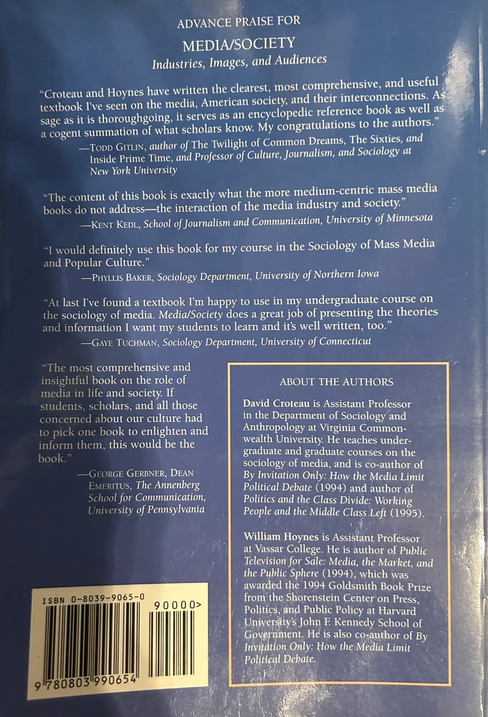 Textbook by David Croteau and William Hoynes. Advance Praise for Media/Society written on the back cover. Purchased: $34.95 Selling: $20