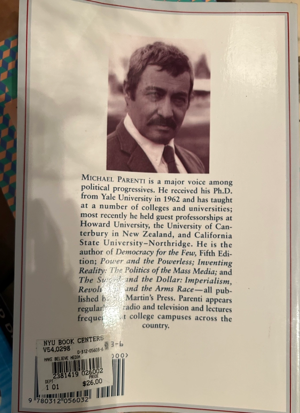 Hardcover book by Michael Parenti. American flag and film strip design on cover. Note: New book. Front cover got a bit bent during move Purchased: $26 Selling: $15