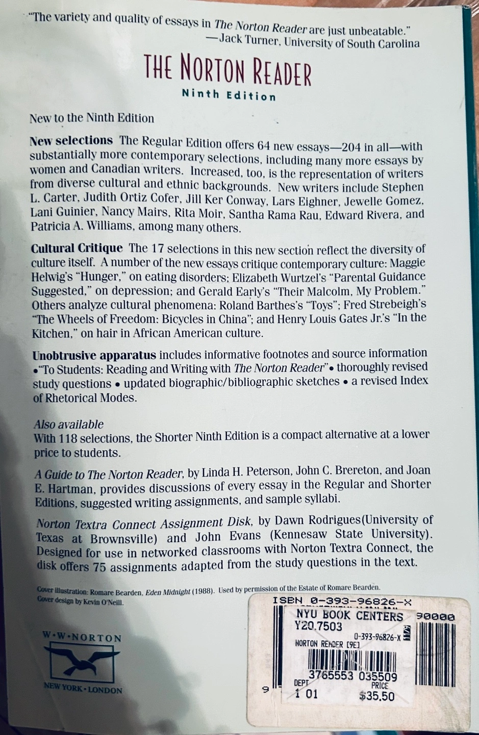 Ninth edition. New selections. Includes essays from various authors, including new writers. Includes a cultural critique section and a section on African American culture. Updated writing/bibliographic sketches. Revised index. Includes 118 selections. Purchased for: $35.50 Selling for: $28