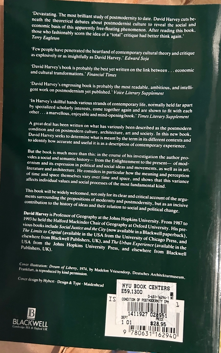 10Paperback edition of The Condition of Postmodernity by David Harvey. Published by Blackwell. Purchased for: $28.95 Selling for: $19