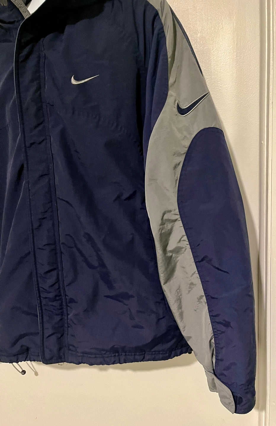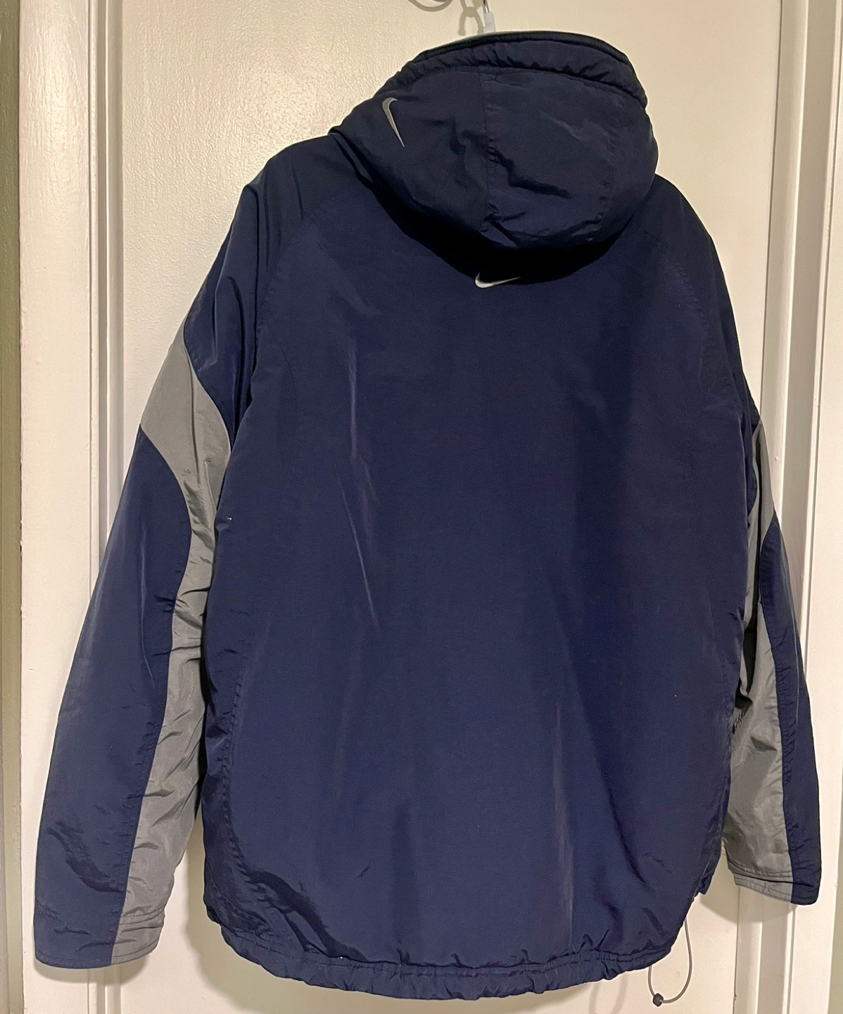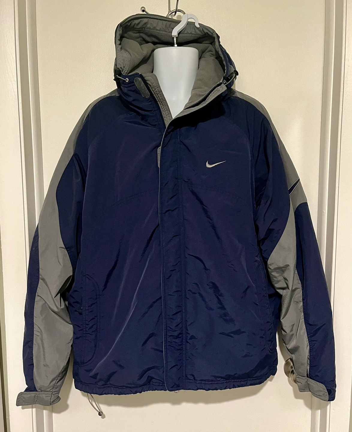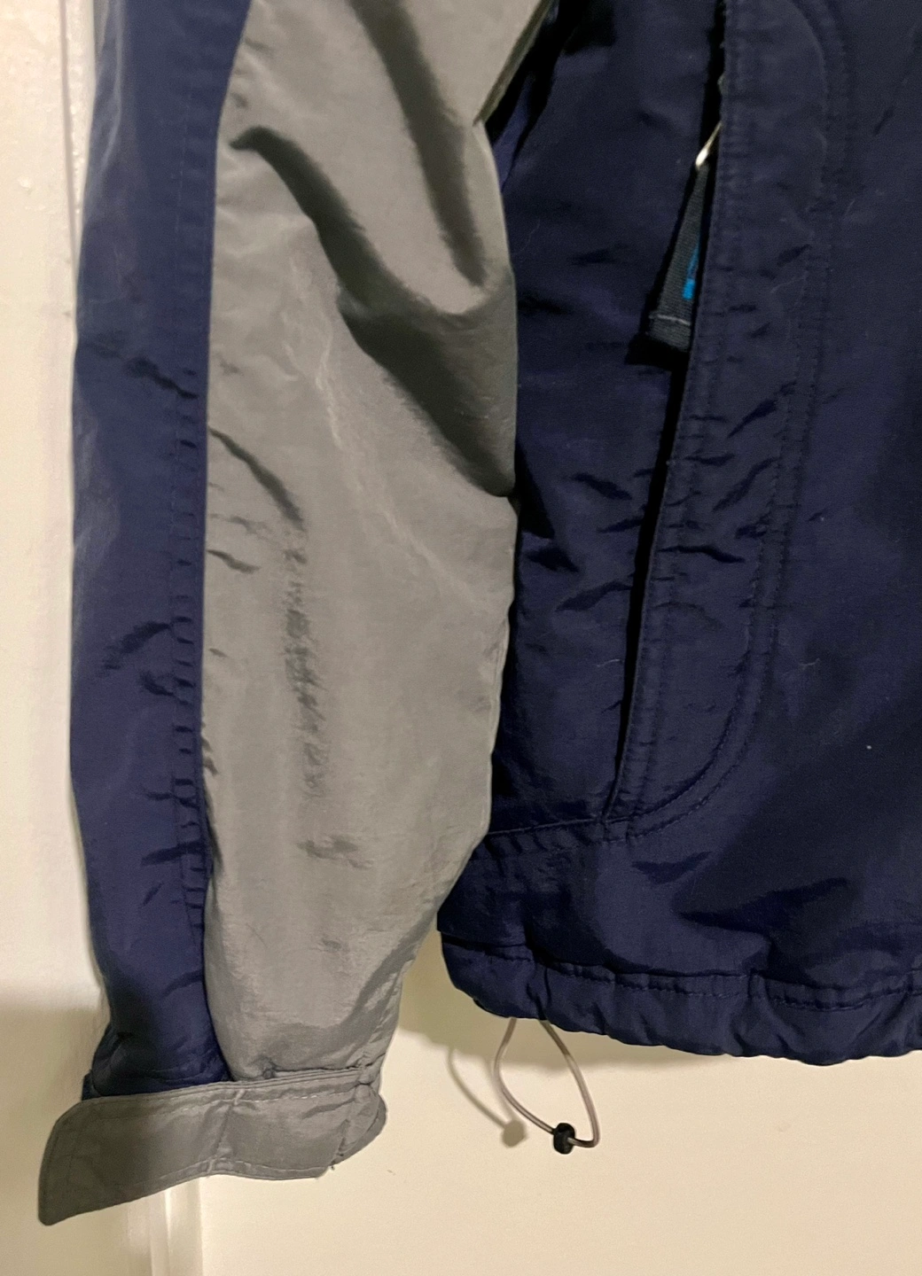 75Navy blue and grey winter jacket with a hood. Features a zipper closure and multiple pockets.