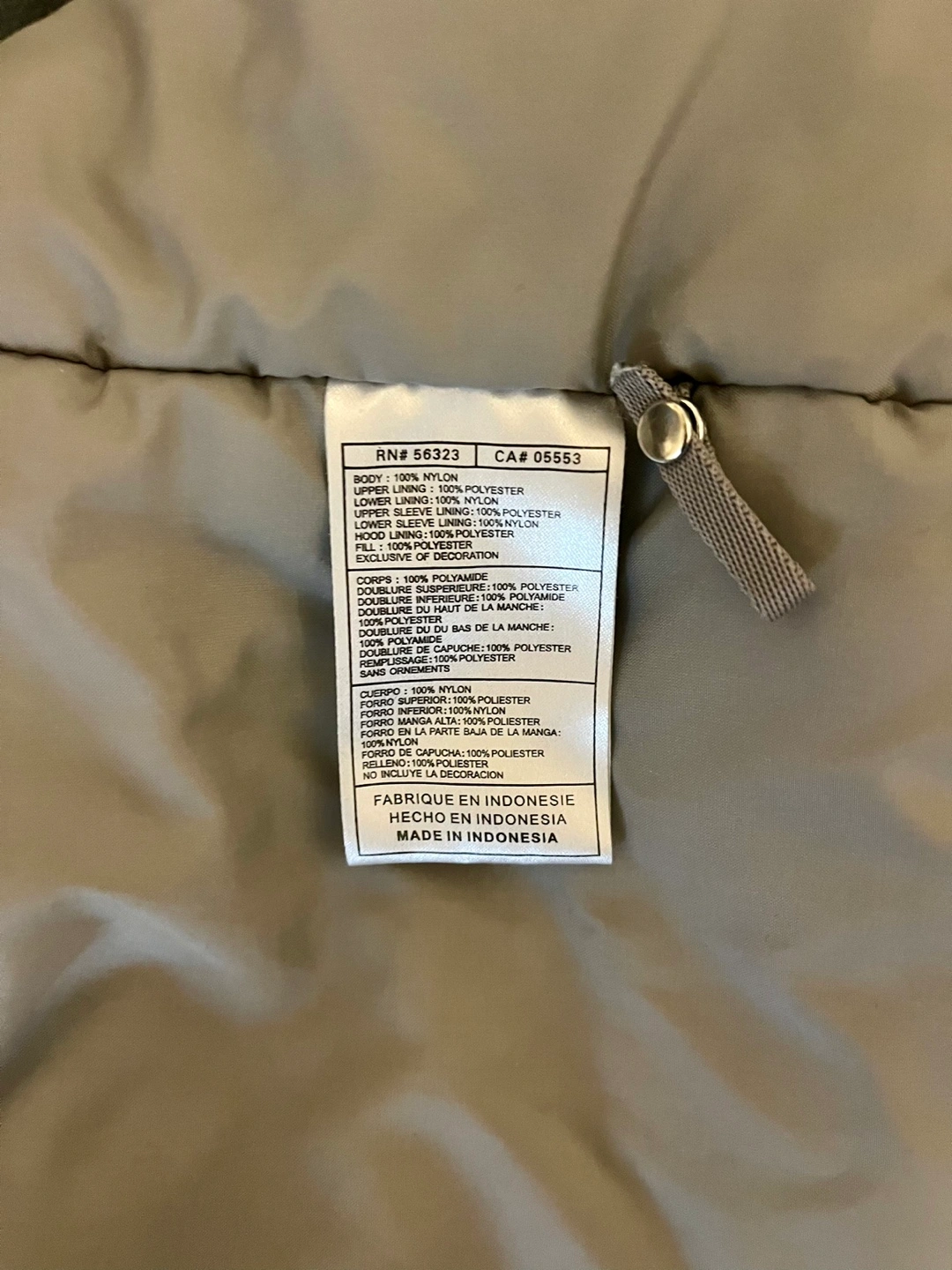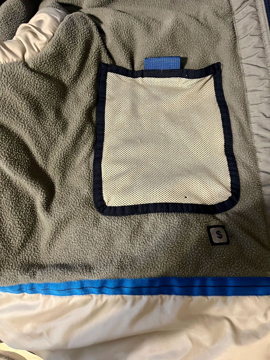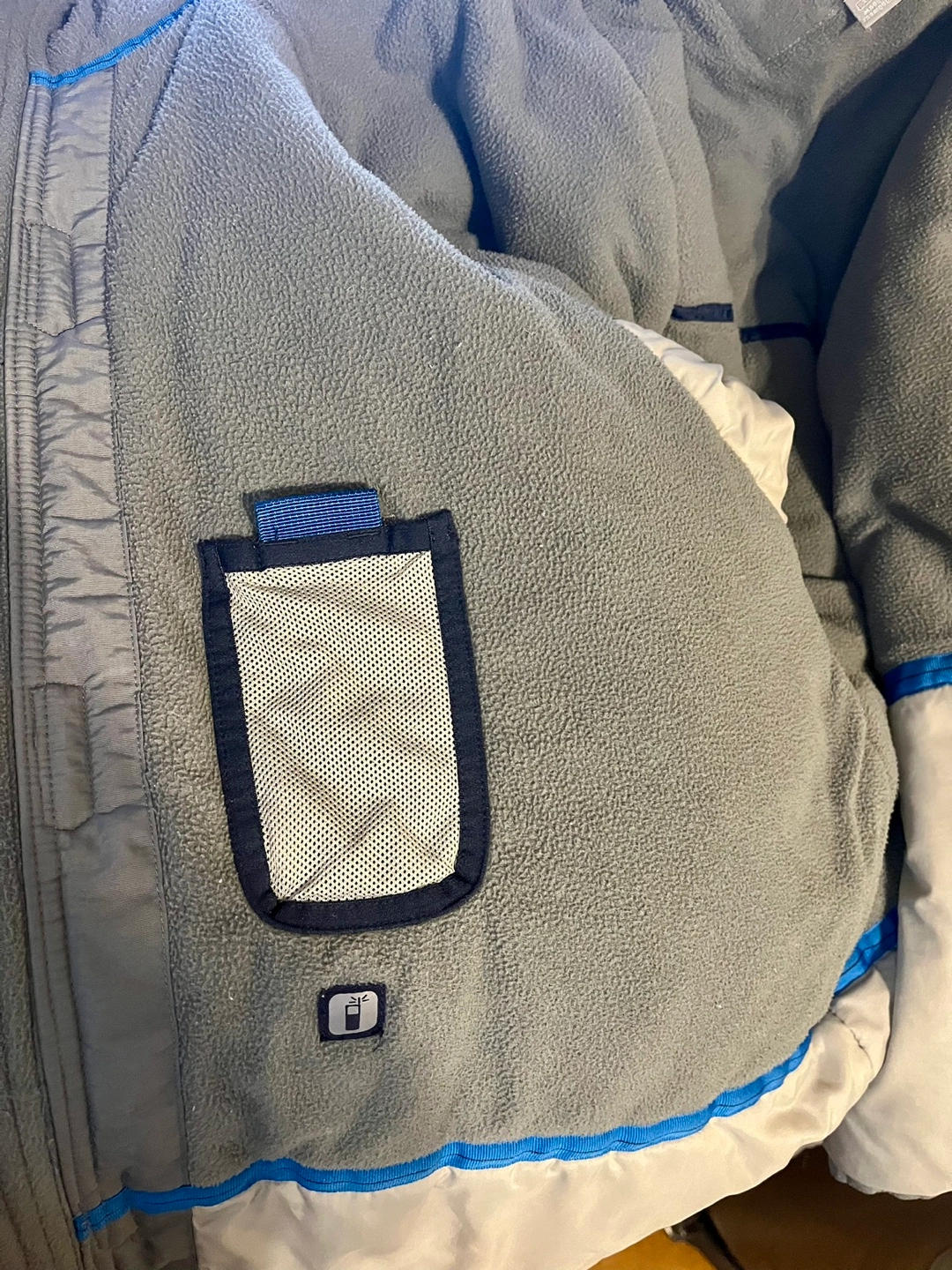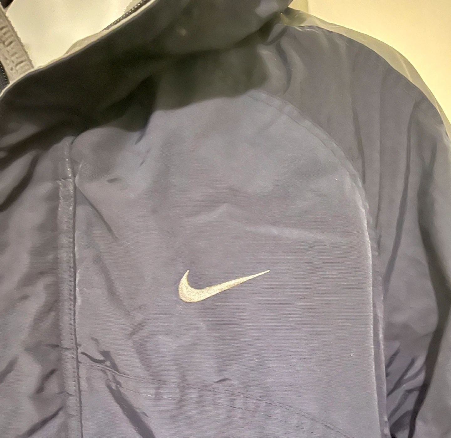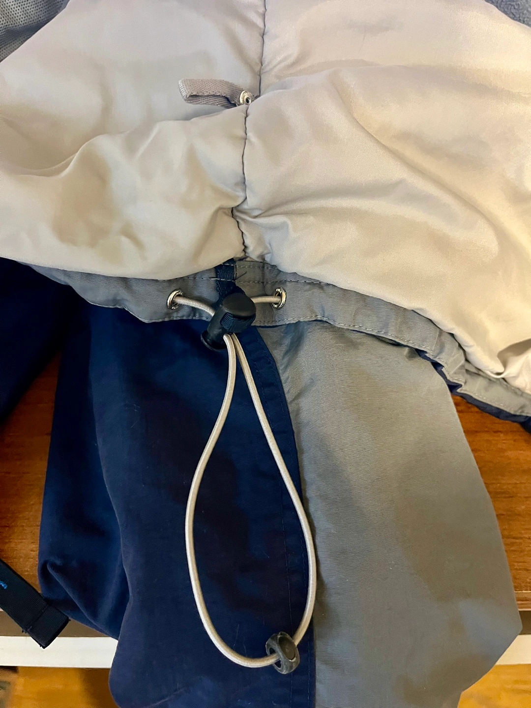 75Navy blue and grey winter jacket with a hood. Features a zipper closure and multiple pockets.