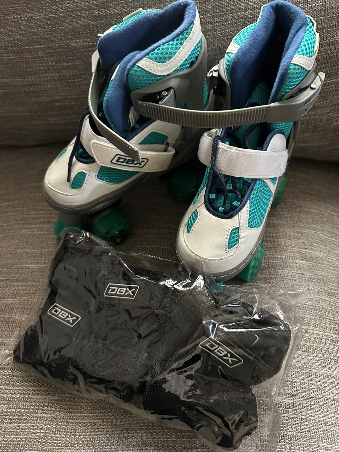 Inline skates, blue and teal color, comes with knee pads and elbow pads! Pick up UES