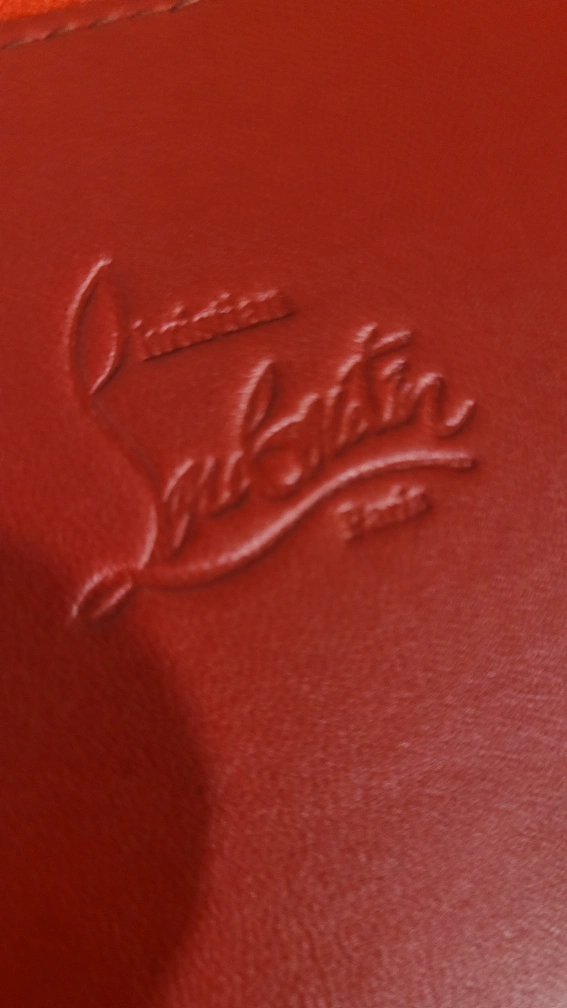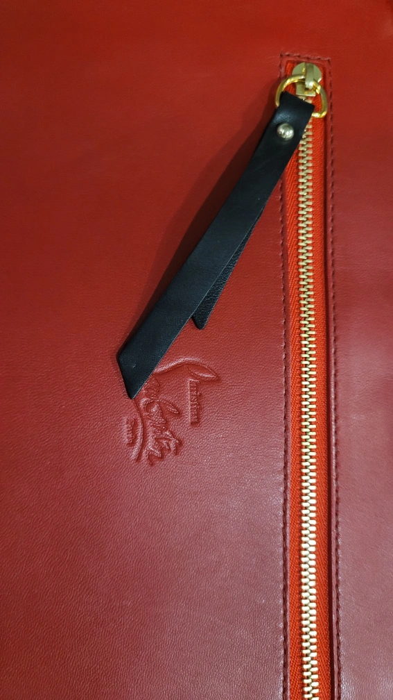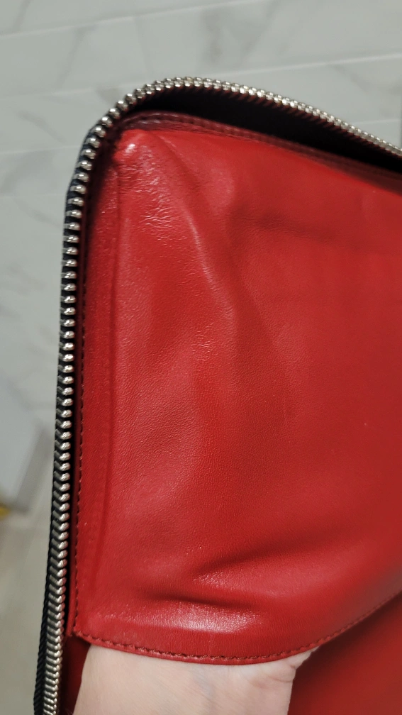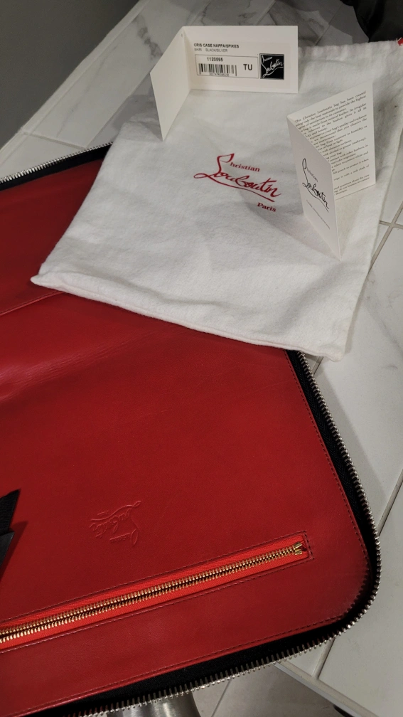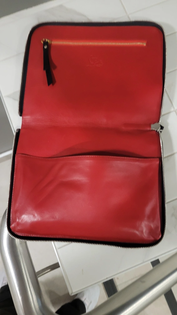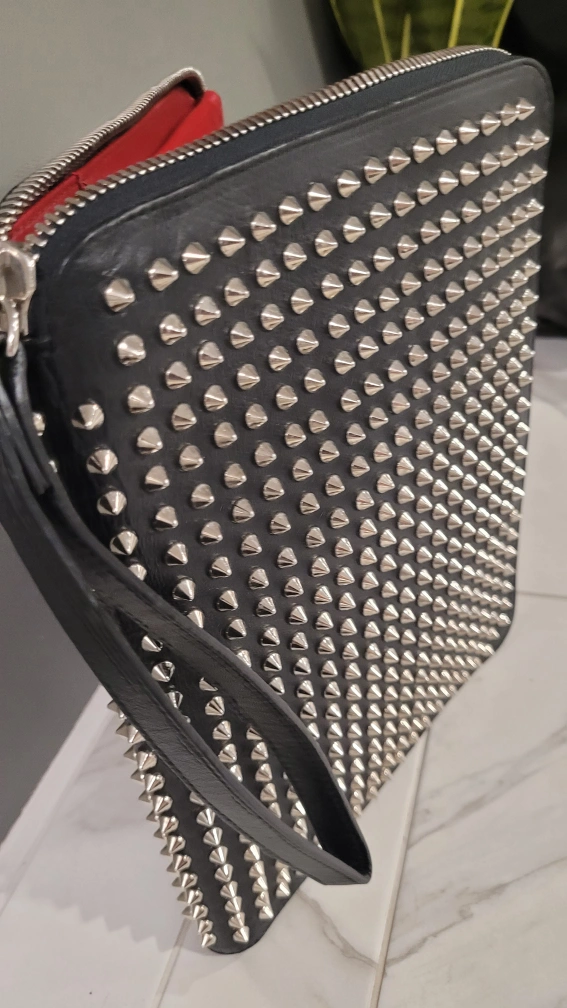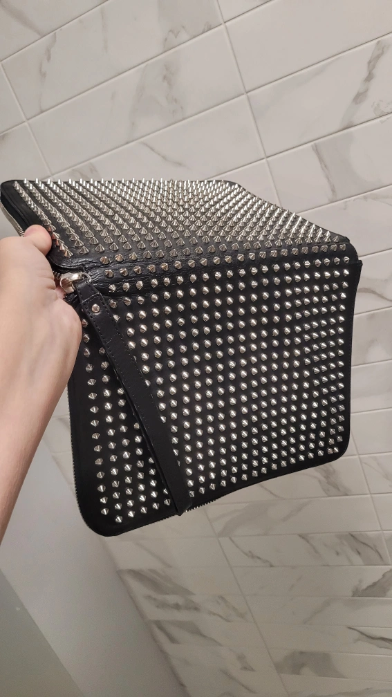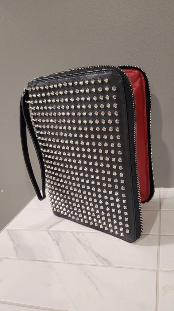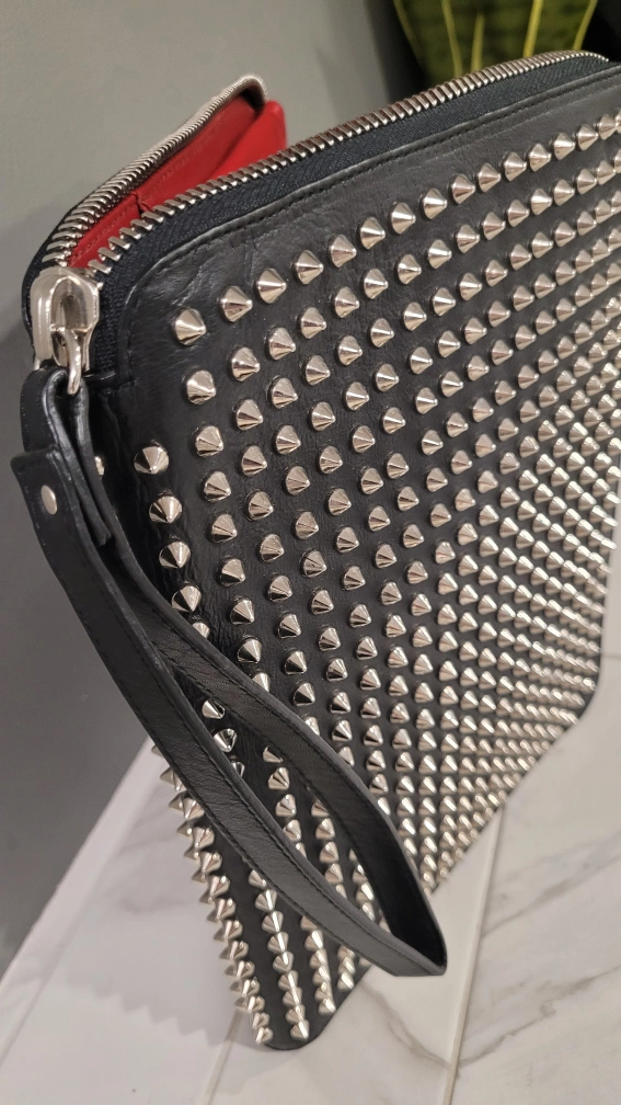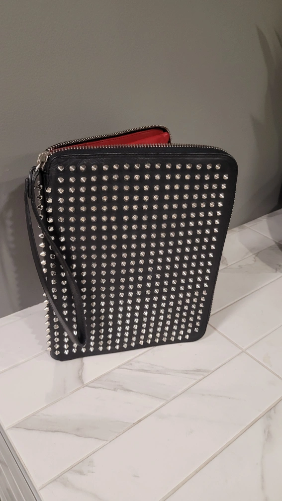 484Black leather clutch with silver studs. Features a red interior lining. Has a zipper closure and a wrist strap. Authentic. Will fit all your office needs. In very good condition.