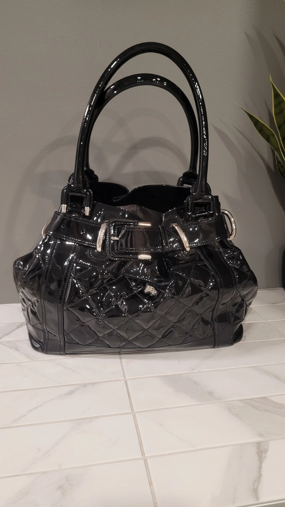 484Authentic Burberry Large black patent leather bag in good condition. inside silk, and clean.