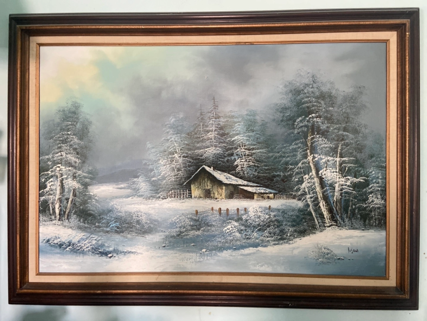 15Framed oil painting of a winter landscape with a cabin and trees. Signed bottom right.