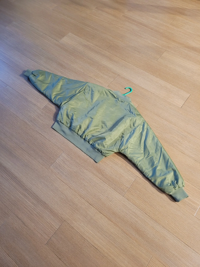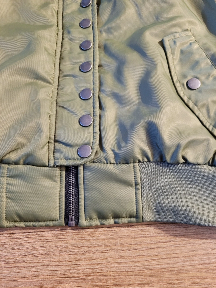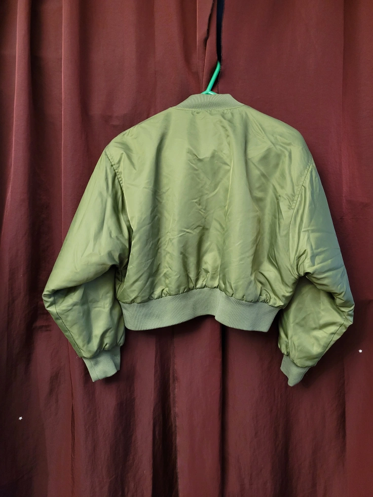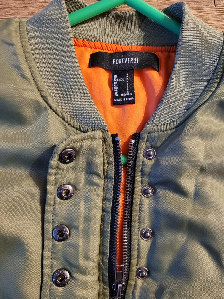 Stylish ladies green puffy bomber jacket with zipper and snap closure. Snap side pockets and orange interior. Length is approximately 19 inches long from shoulder to bottom of coat. Brand: Forever 21 Reads Size small with bigger puffy feel that feels more medium like.
