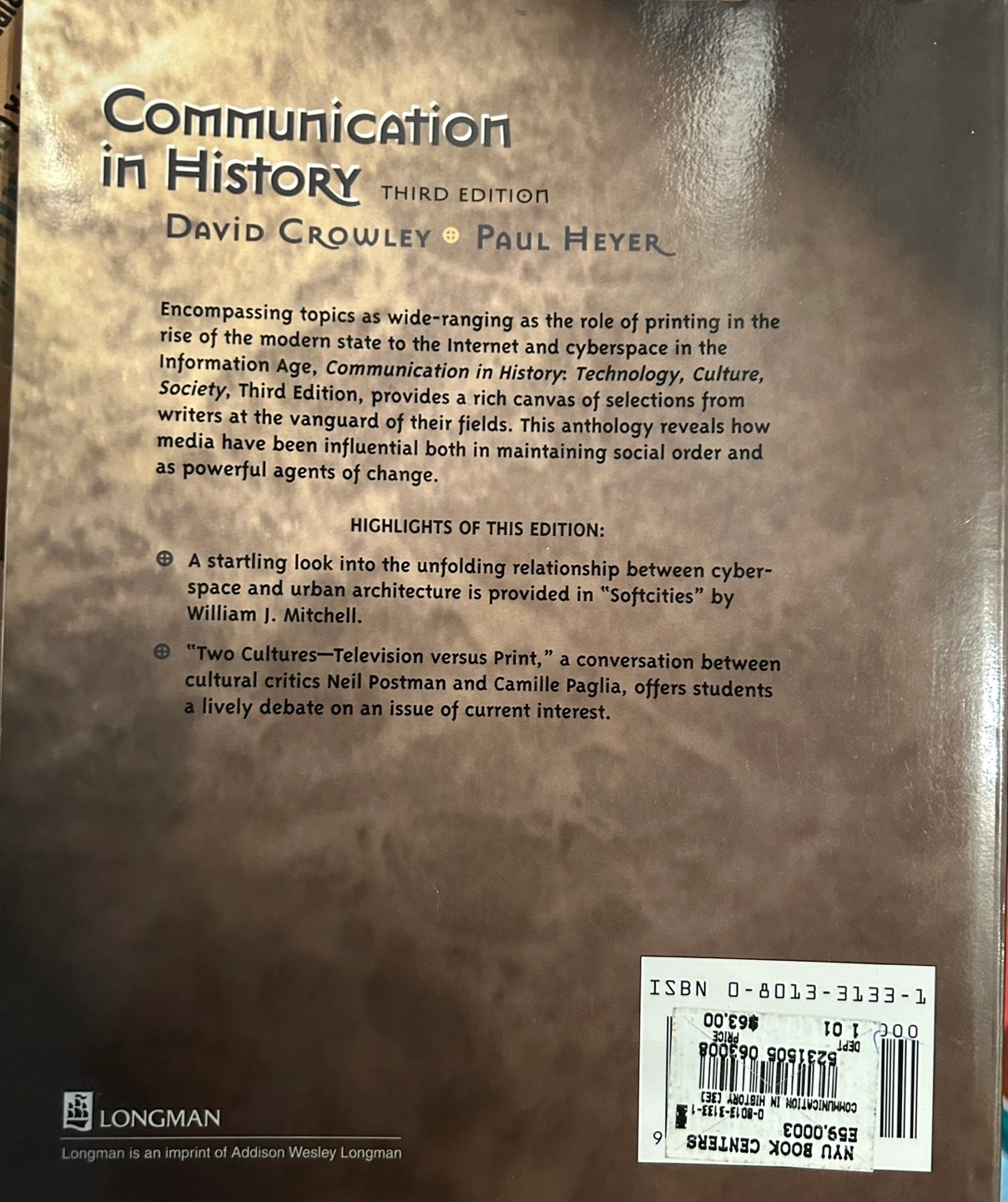 10Third Edition. Paperback. Encompasses topics as wide-ranging as the role of printing in the rise of the modern state to the Internet and cyberspace in the Information Age. Communication in History, Technology, Culture, Society, Third Edition, provides a rich canvas of selections from writers at the vanguard of their fields. This anthology reveals how media have been influential both in maintaining social order and as powerful agents of change. Purchased: $63 Selling: $49