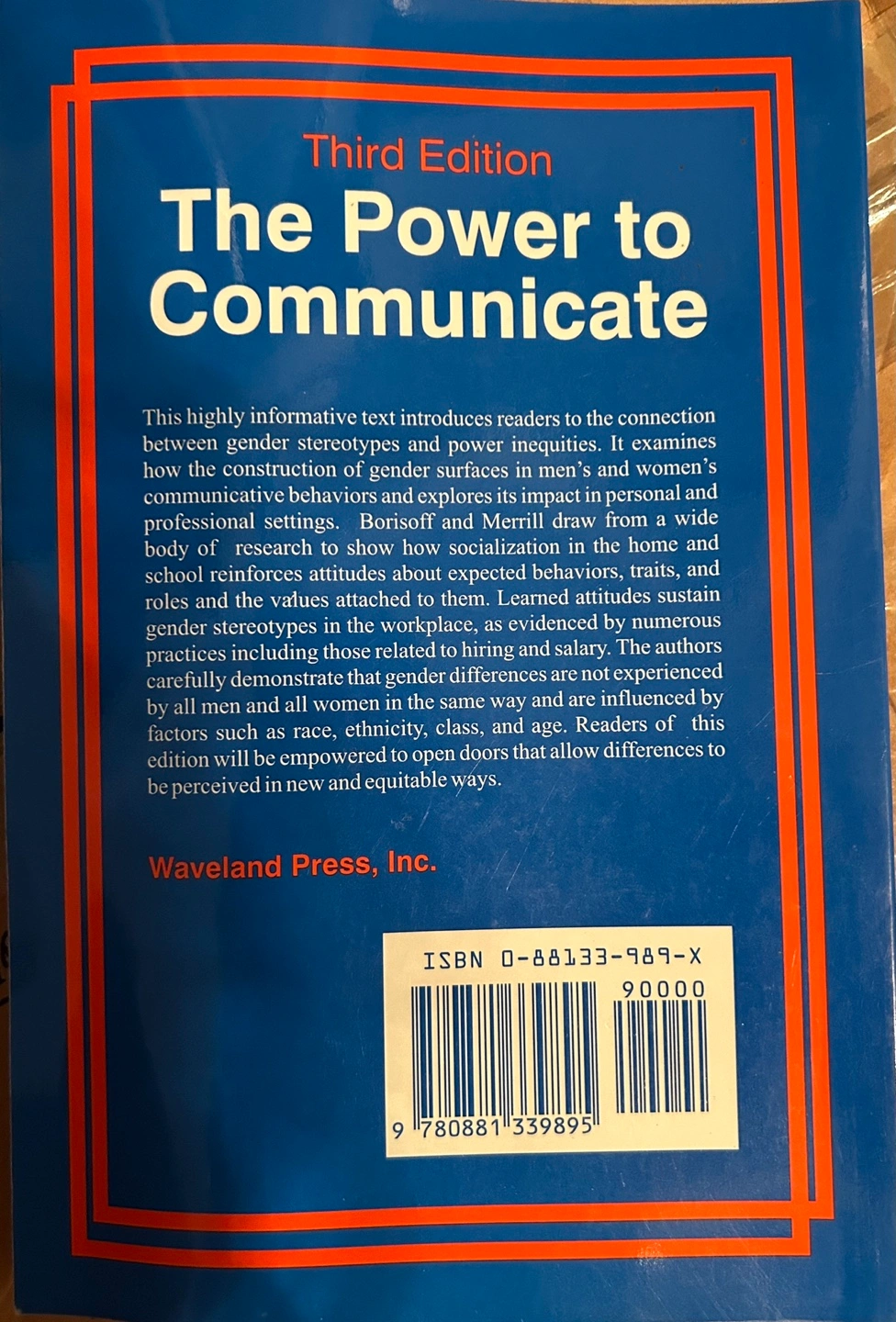 10Third Edition textbook. Covers gender stereotypes and power inequities, communication, and the connection between the construction of gender surfaces in men's and women's communication behaviors and experiences as apparent in interactions, professional settings. Based on social behaviors from a wide body of research to show how expectations in the home and school reinforce attitudes about socialized behaviors, traits, and roles and the values attached to them. Learned attitudes sustain gender stereotypes in the workplace, as evidenced by numerous practices including those related to hiring and salary. The authors carefully demonstrate that gender differences are influenced by all men and all women in the same way and are not experienced by factors such as race, ethnicity, class, and age. Purchased: $27 Selling: $18