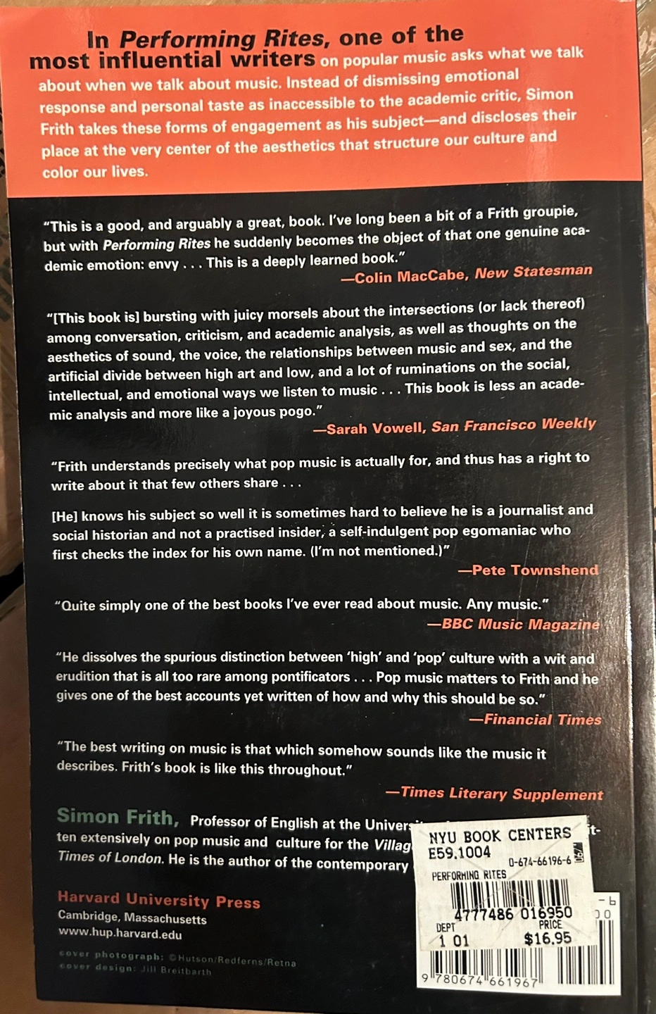 10Paperback book by Simon Frith, Professor of English at the University of London. Discusses popular music and culture for the Village Voice. Purchased: $$16.95 Selling: $10