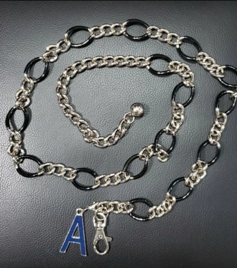 1000+A/X Silver chain belt with black accents. Has a clasp and a charm with a blue letter A.
