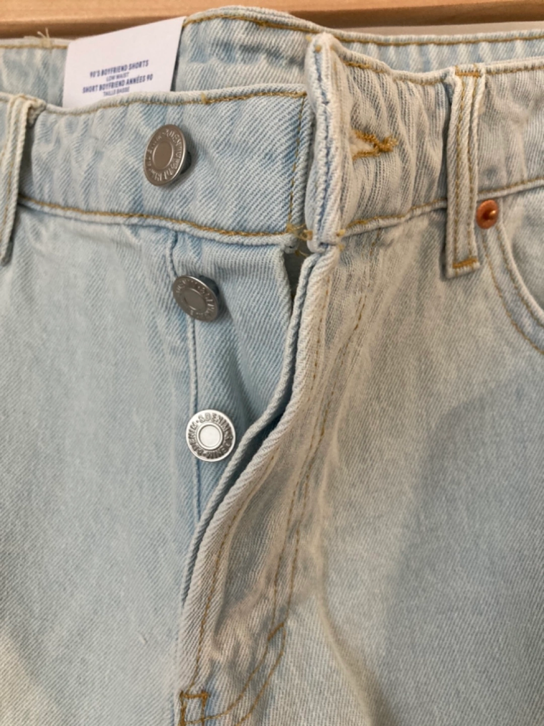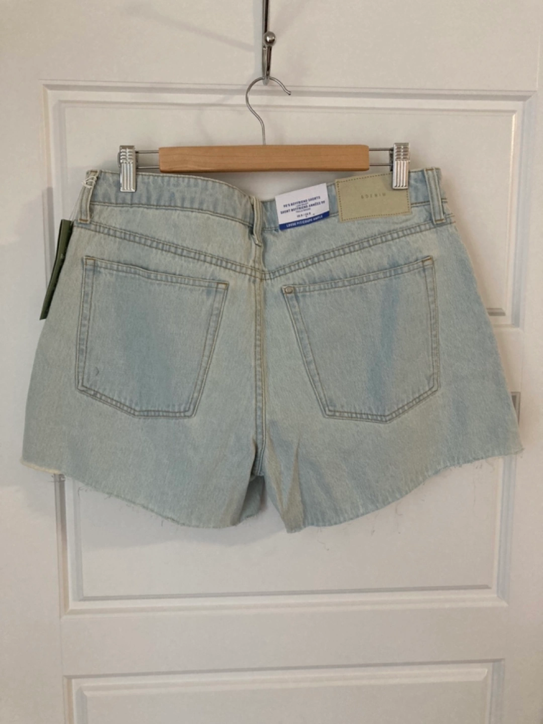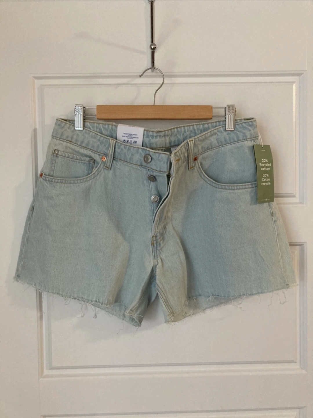New with tags. Light blue denim cut-off shorts, low waist, loose fit, raw hem, button fly.