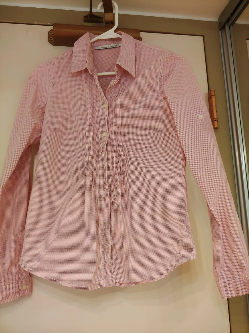 Long sleeve button down shirt with a plaid pattern. The shirt has a collared neckline and a button-up front. The shirt also has long sleeves with button cuffs.100% cotton