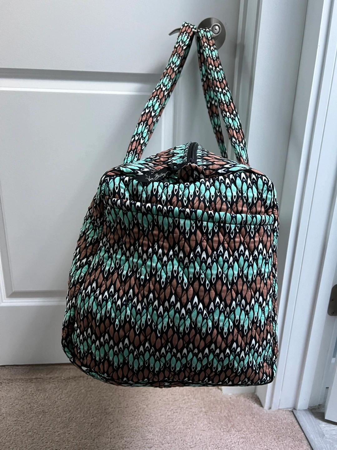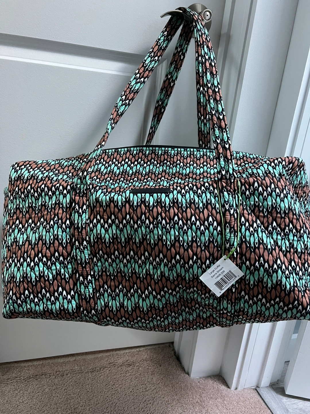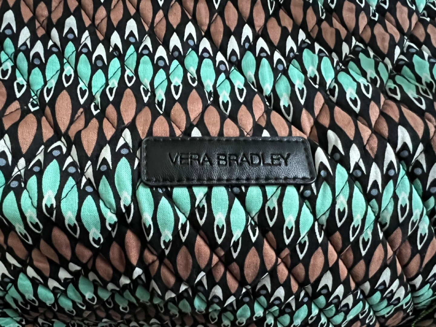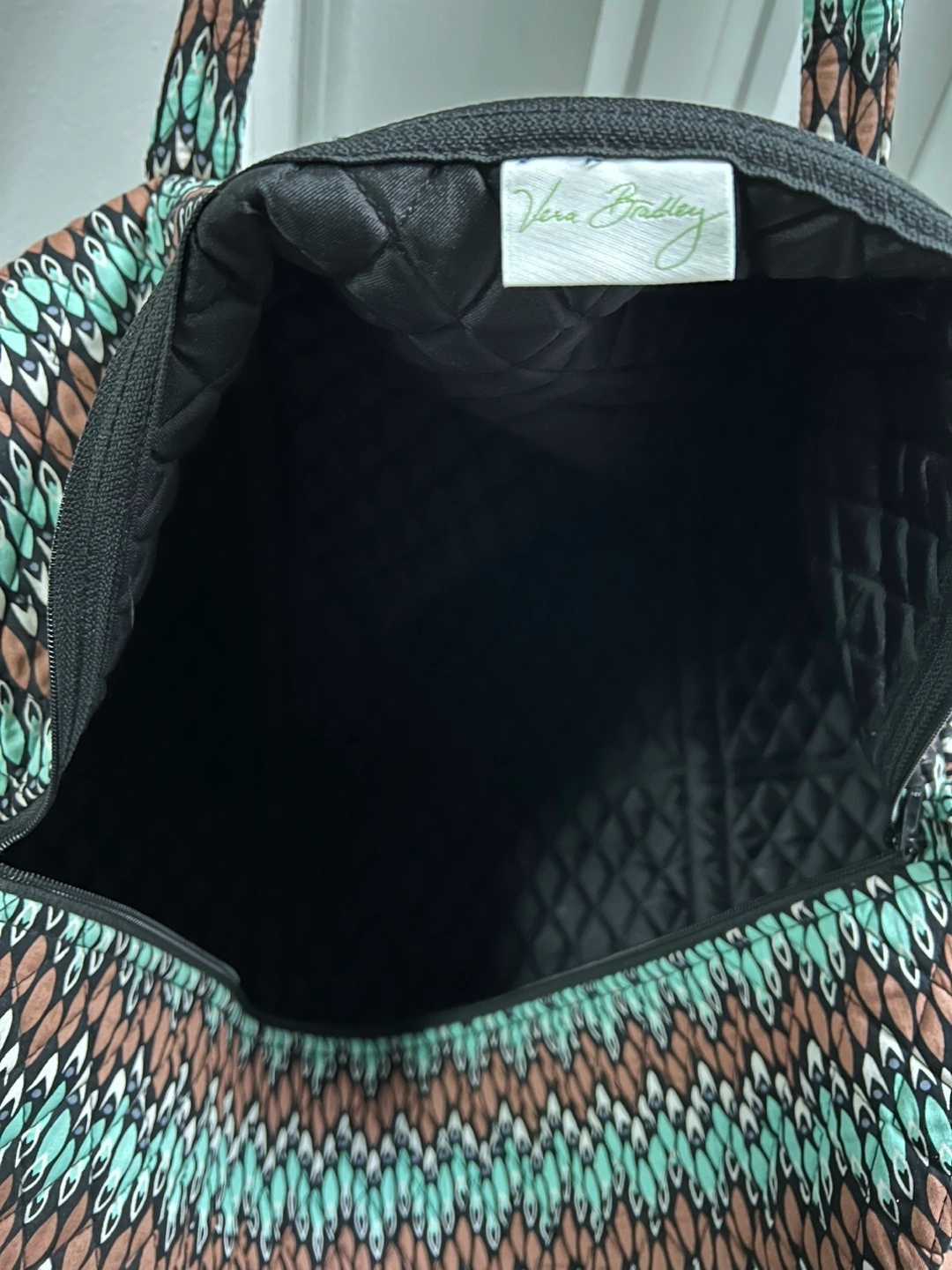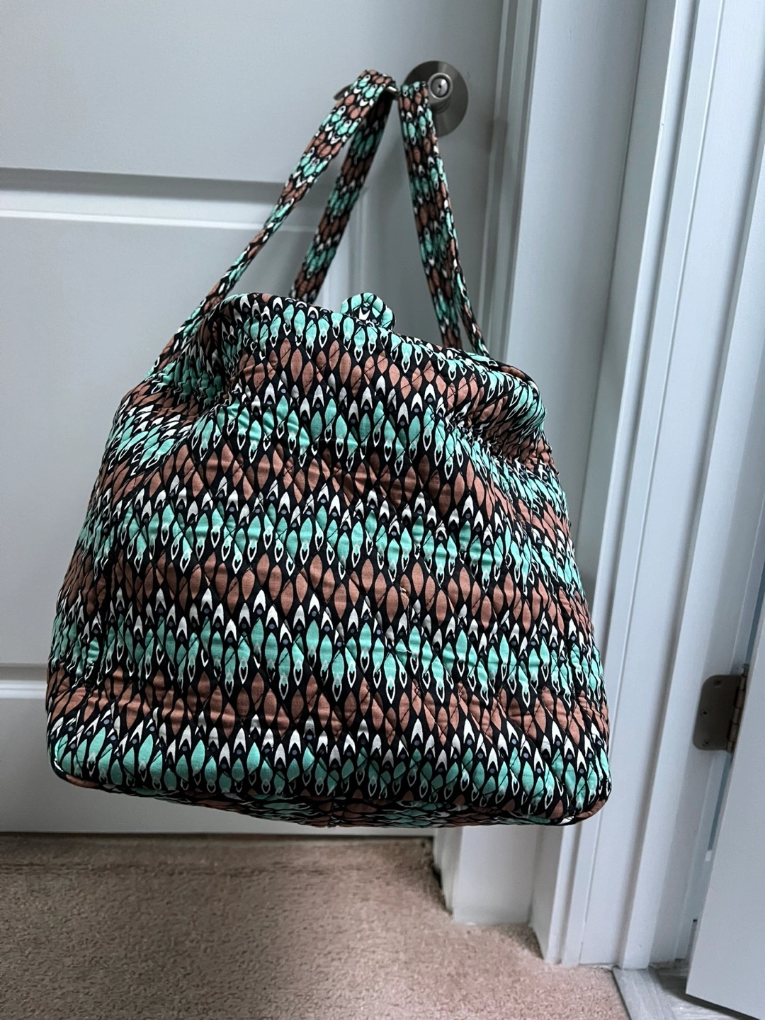 -Washable quilted fabric in multi-color pattern with a solid black interior -Spacious open interior with a fully zippered top closure, and open end slip pocket -Folds flat for easy storage -Double straps with a drop of about 16 inches -Measures approximately 22" (L) x 11.5" (H) x 11.5" (W)