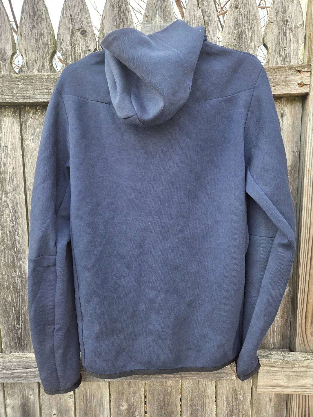 Navy blue Nike Tech Fleece full zip hoodie. Size small. Made in Vietnam. It features a zippered pocket on the left sleeve. This hoodie's material is soft and warm.