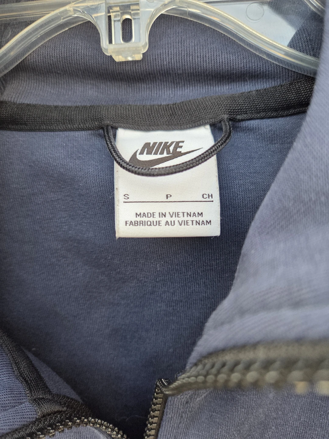 Navy blue Nike Tech Fleece full zip hoodie. Size small. Made in Vietnam. It features a zippered pocket on the left sleeve. This hoodie's material is soft and warm.