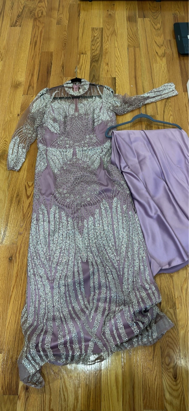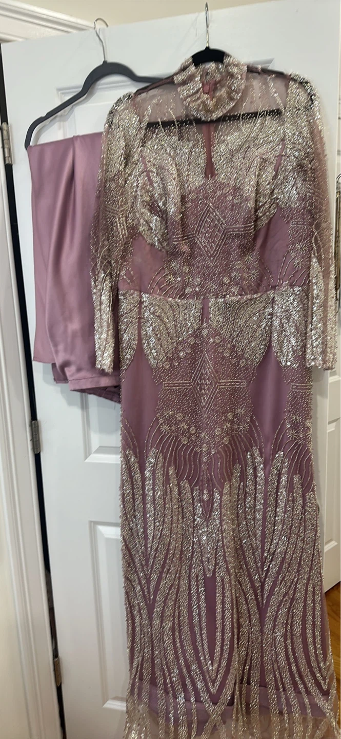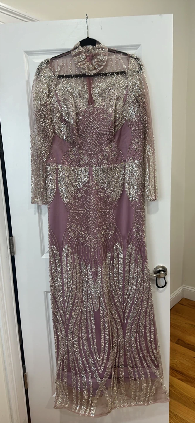 This elegant gown features intricate silver embellishments on a sheer overlay with long sleeves. It's a stunning choice for special occasions. Includes a matching satin scarf.