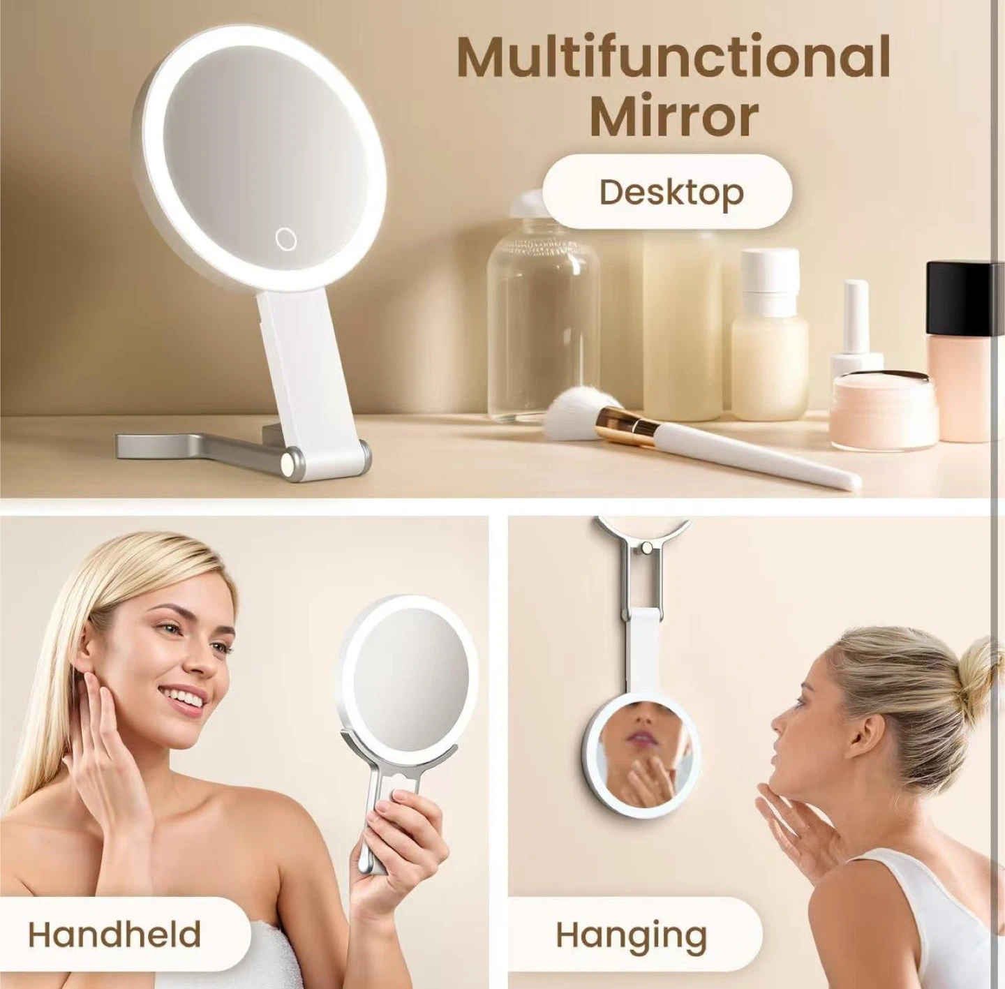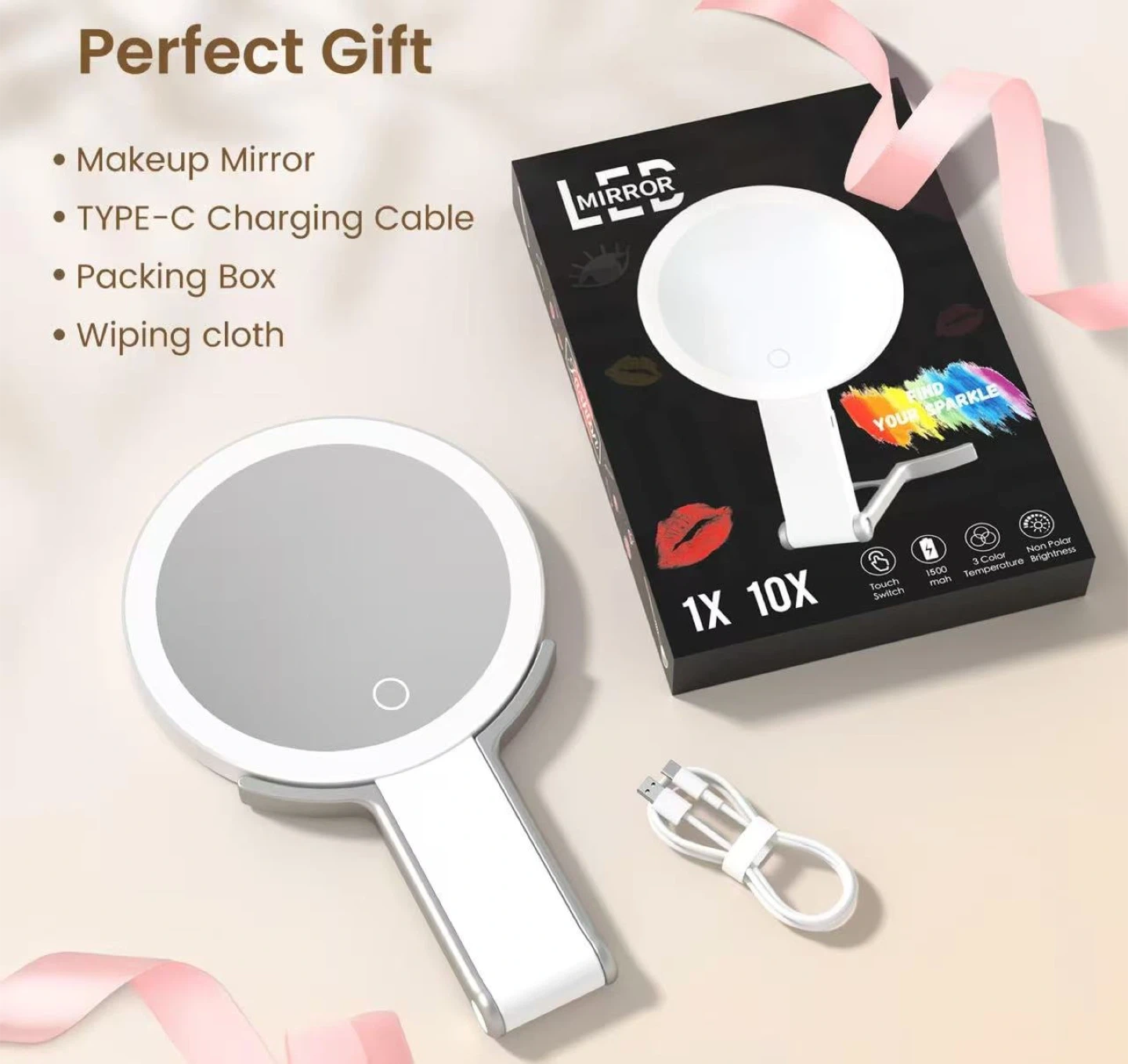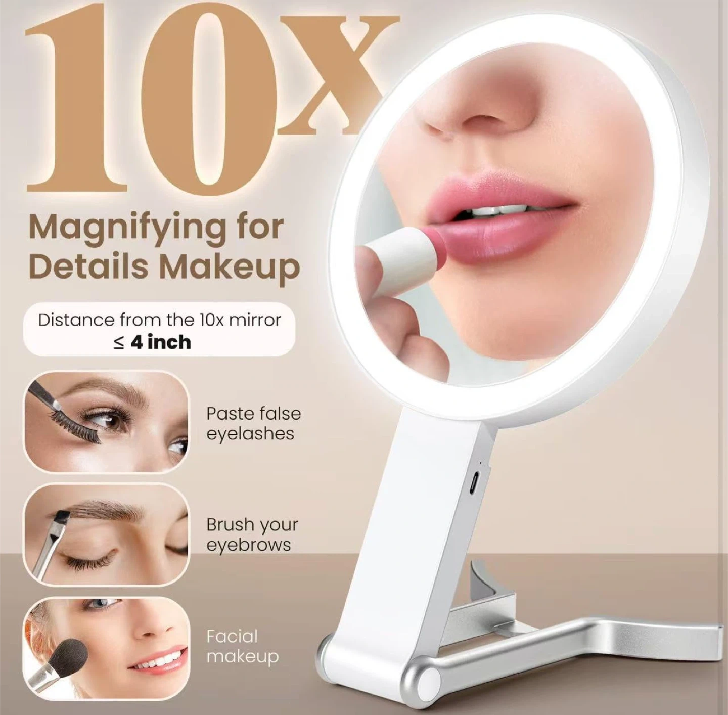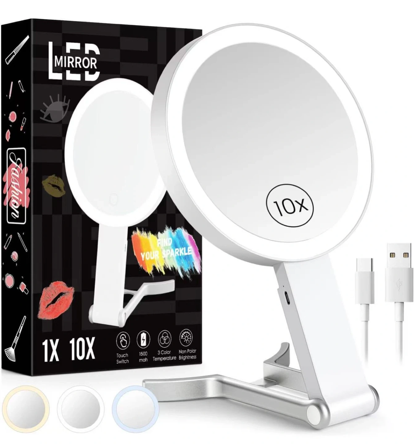 172Travel Makeup Mirror with Light, 10X/ 1X Double Sided Rechargeable Magnifying Mirror with 3 Color Lights Modes, USB Type C Portable LED Mirror Gifts for Women Girls Desktop Hanging Handheld (White)