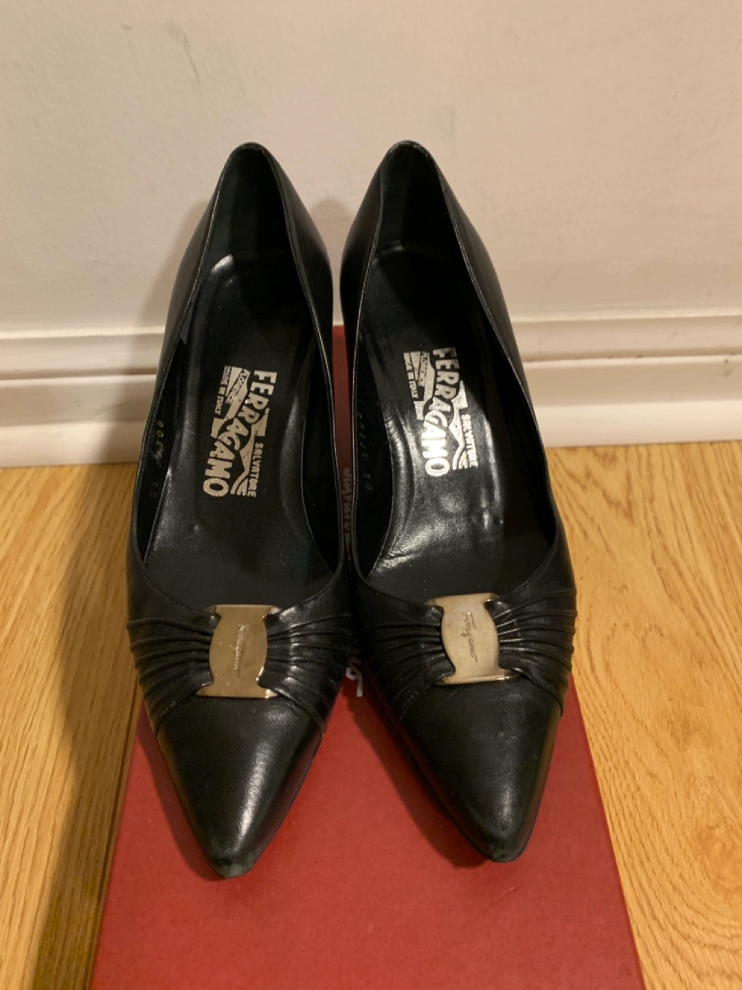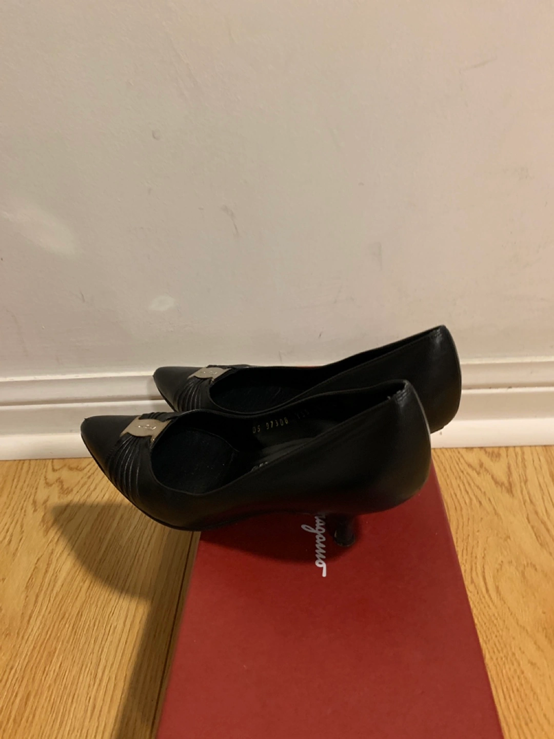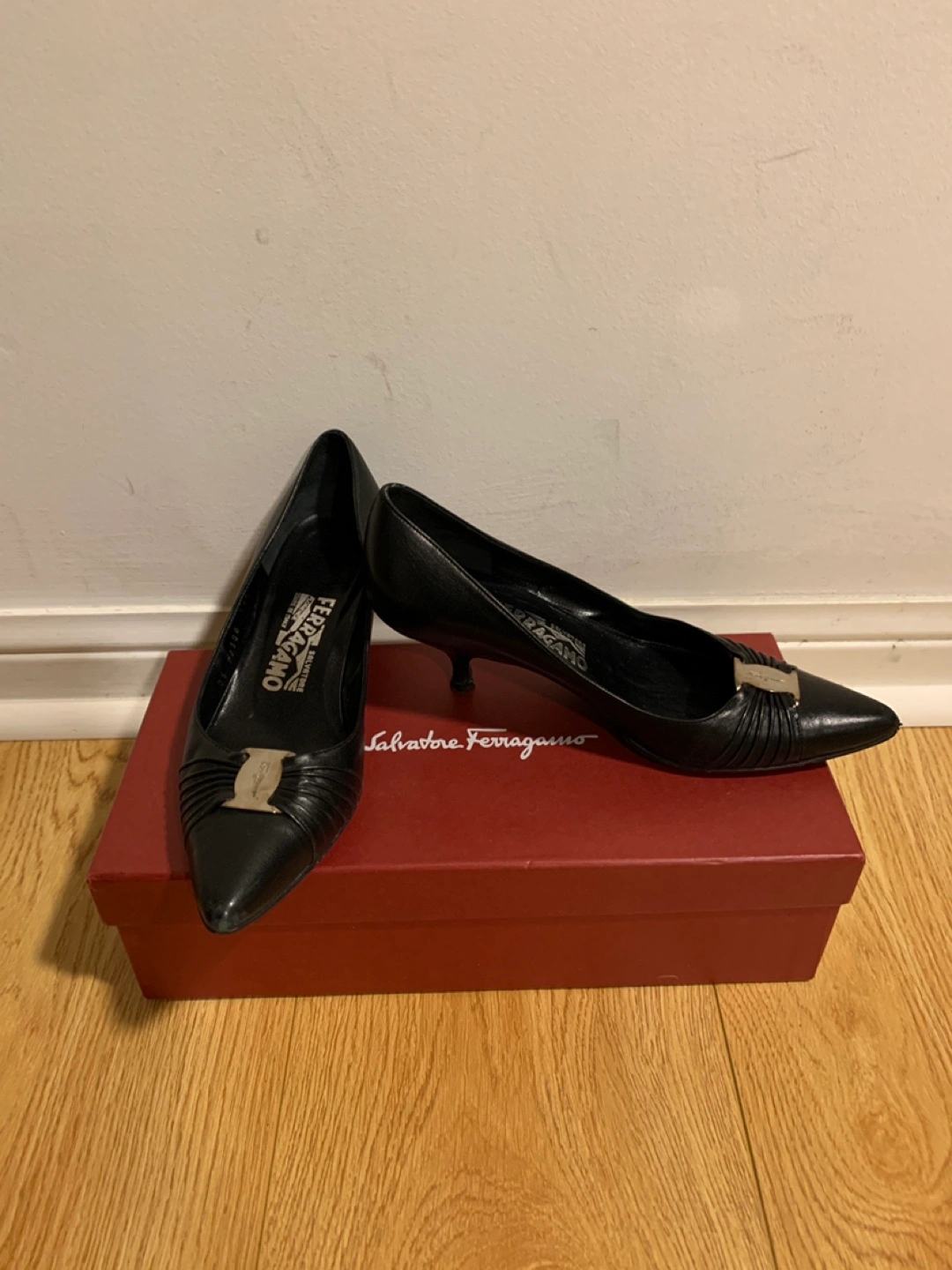 Brand: Ferragamo Black leather heels with silver buckle detail. Size 6. Comes with original box. Pick up near Highway 7 and Warden. Low ballers will be ignored.