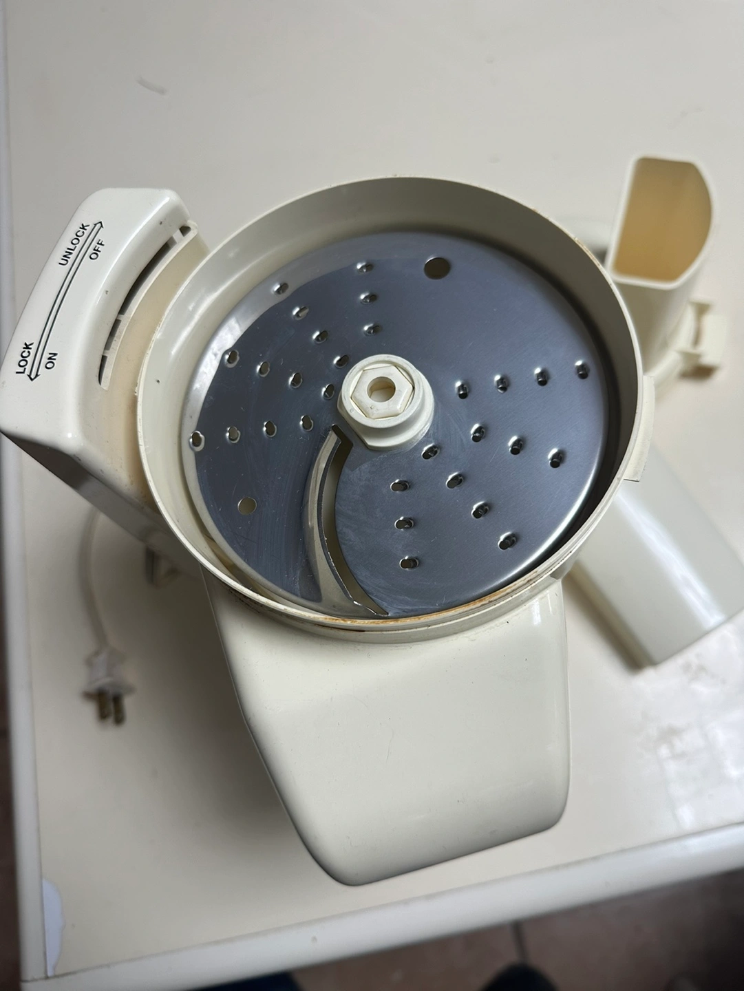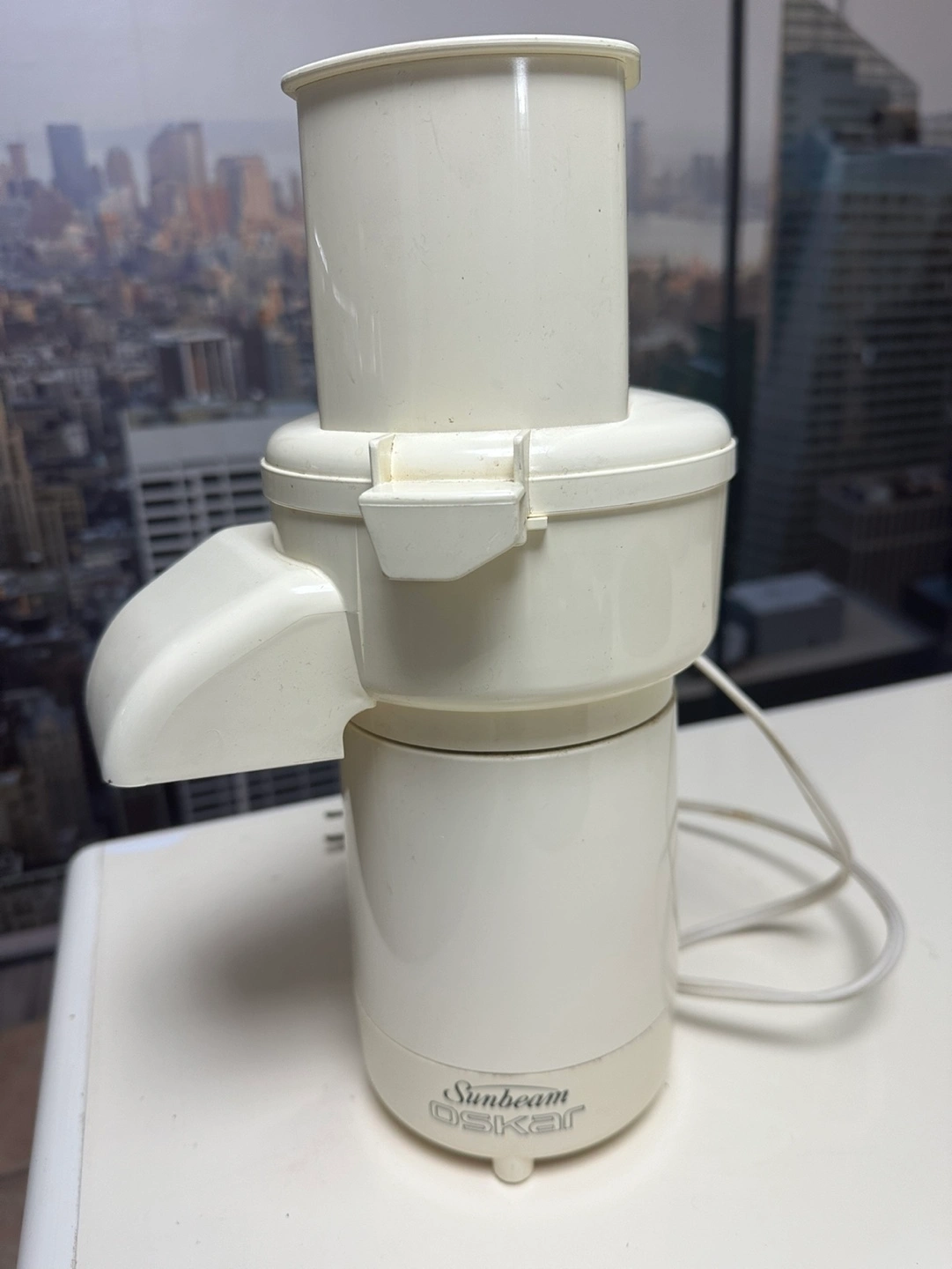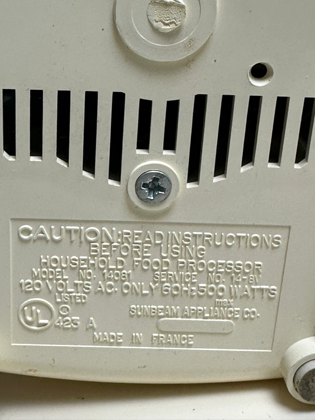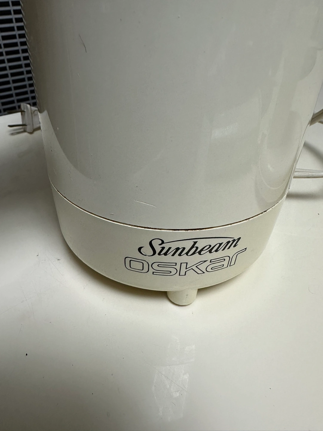 23Vintage Sunbeam Oskar food processor. Model 14081. White. Has some wear and tear. Tested and works.