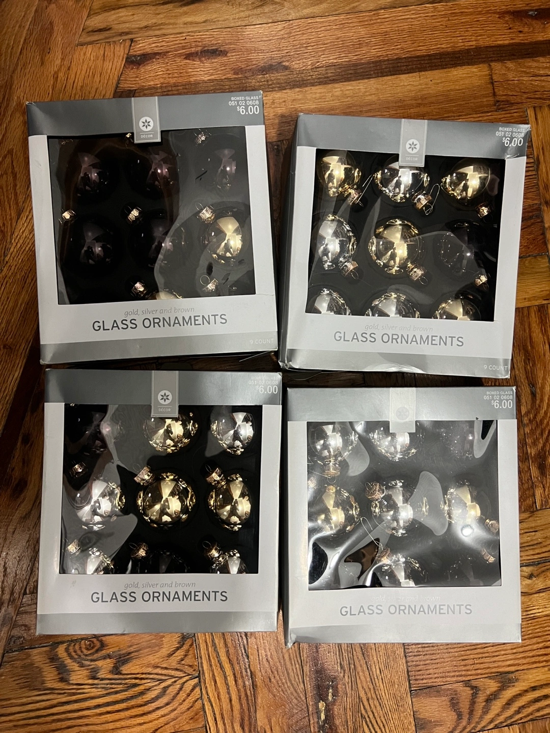 4 Box of Glass ornaments in gold, silver, and brown. 9 pieces in each box.