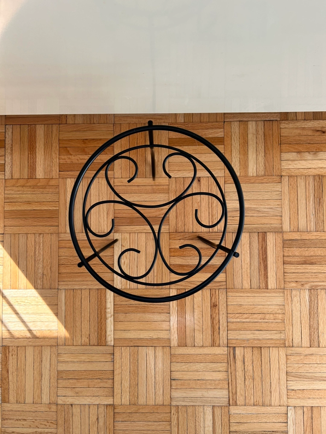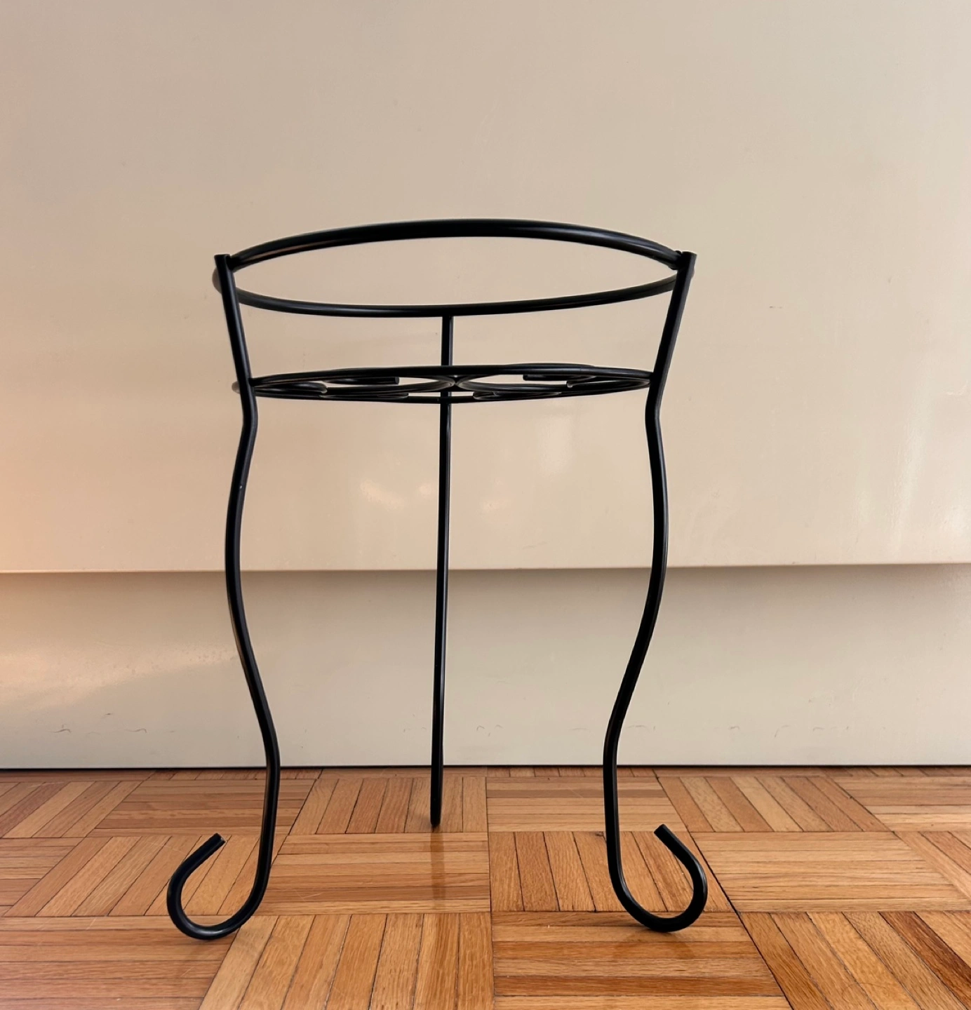Never Used! Black metal plant stand with three legs and a round top. Ornate design. Item dimensions: L x W x H 11 x 11 x 15 inches