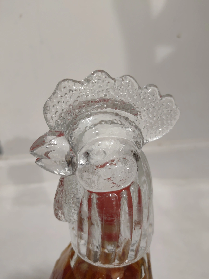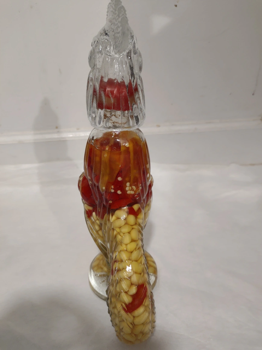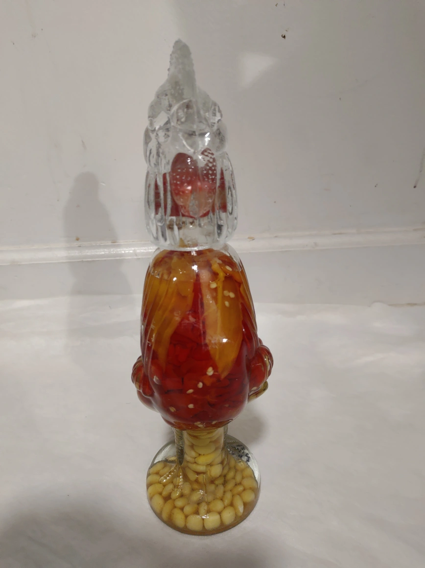 44Rooster shaped glass bottle with peppers and corn inside. Great for display or to use as a unique decanter.