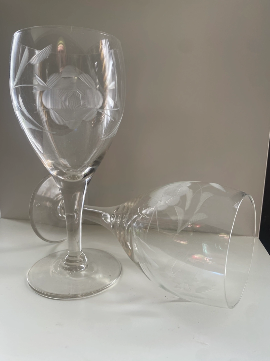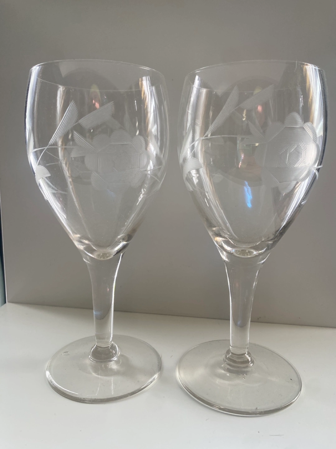 328Set of two vintage etched wine glasses. Clear glass with an etched design. Free! Pickup on Astoria Blvd South and 38th Street. #freecycle