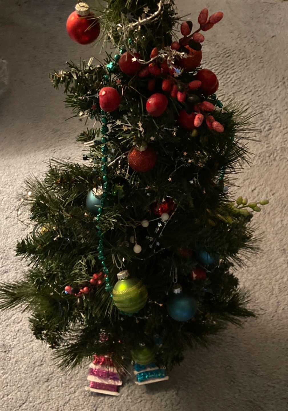 15Small artificial Christmas tree with ornaments and garland. Tree is pre-lit.