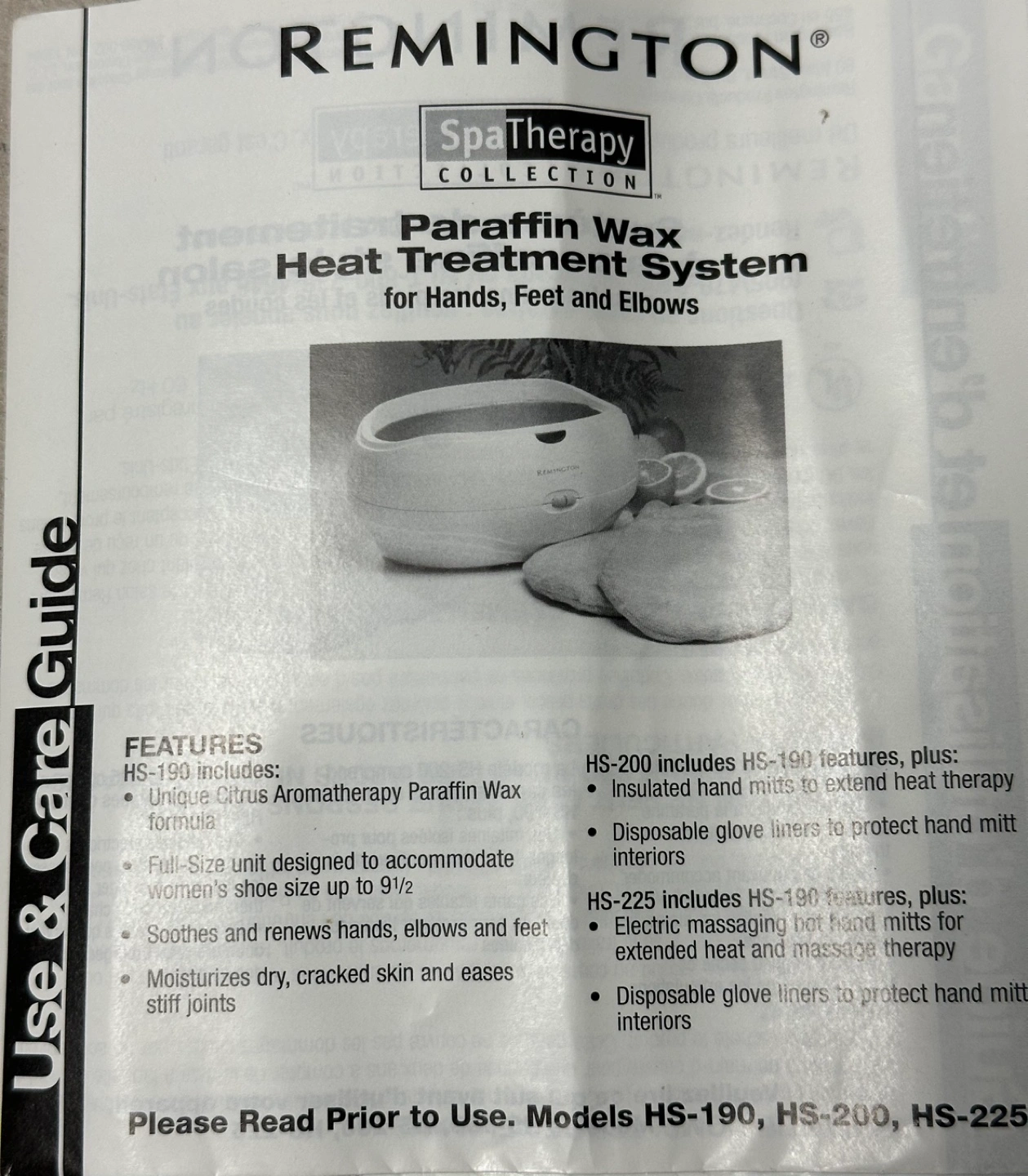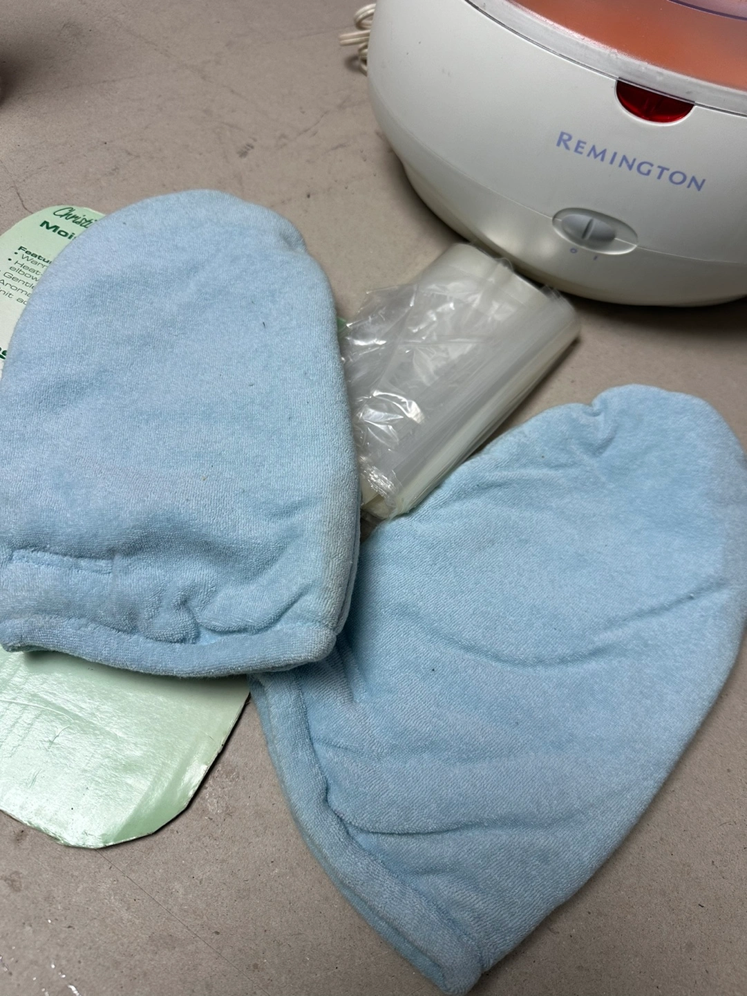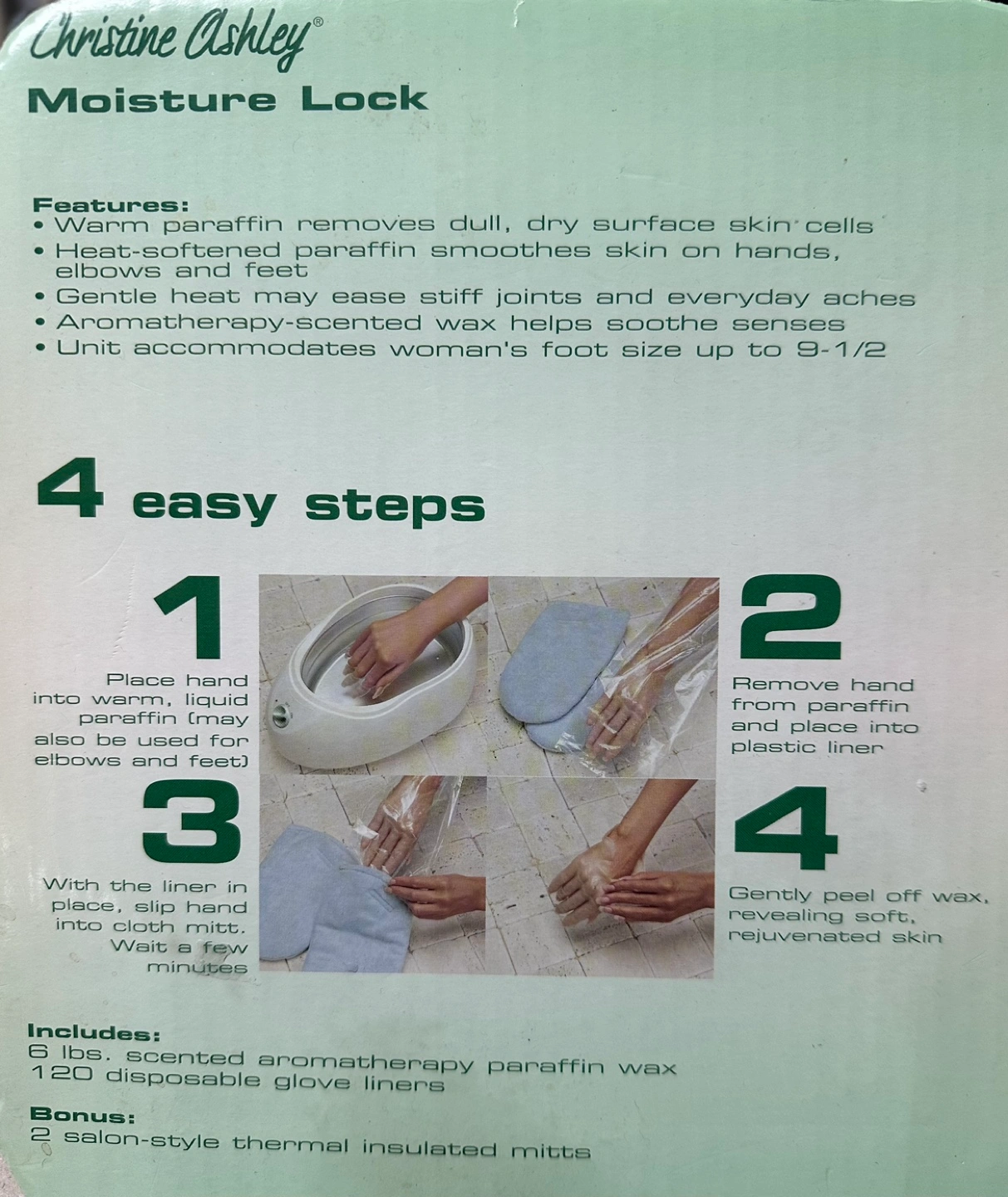 Paraffin wax warmer, includes gloves and liners. Warms and softens hands, elbows, and feet. Includes scented wax