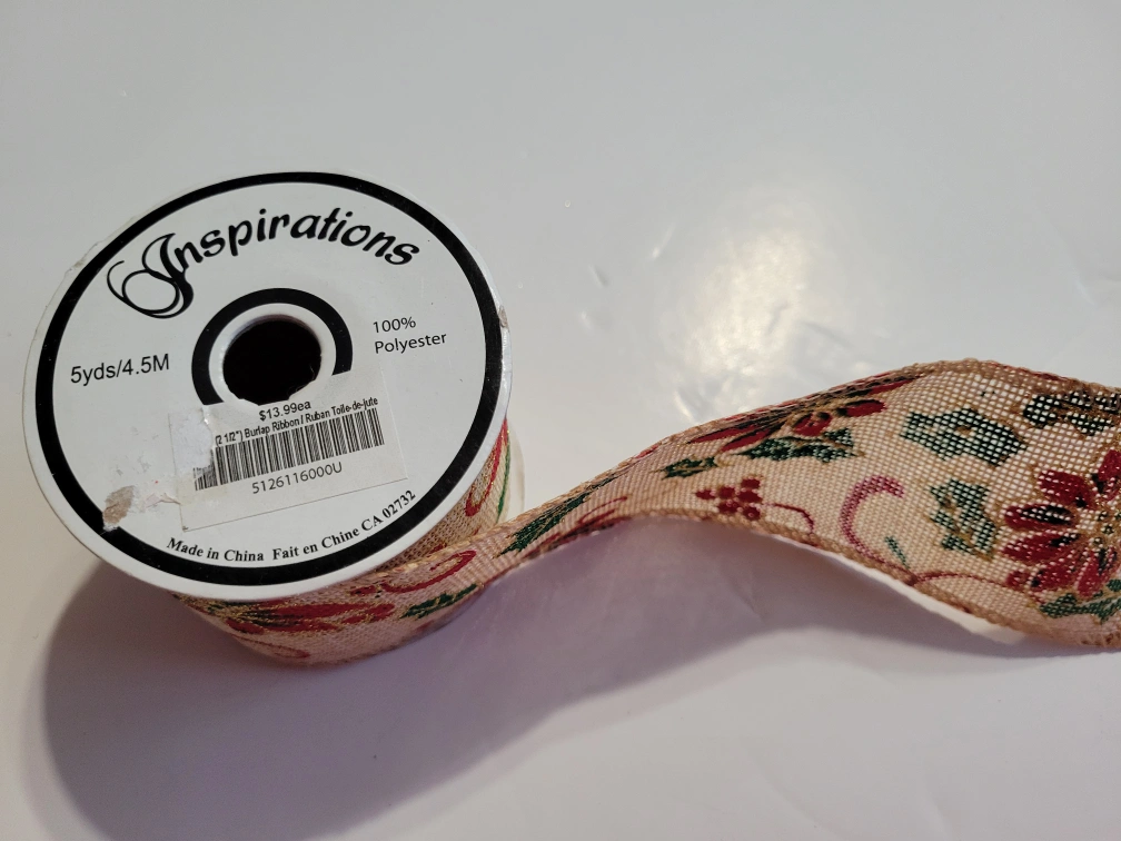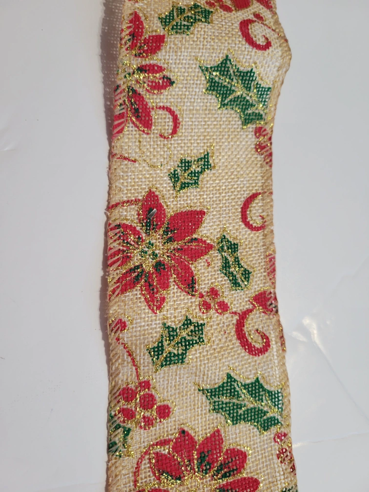 -Features red poinsettia flowers, green holly leaves, and gold accents on a beige background