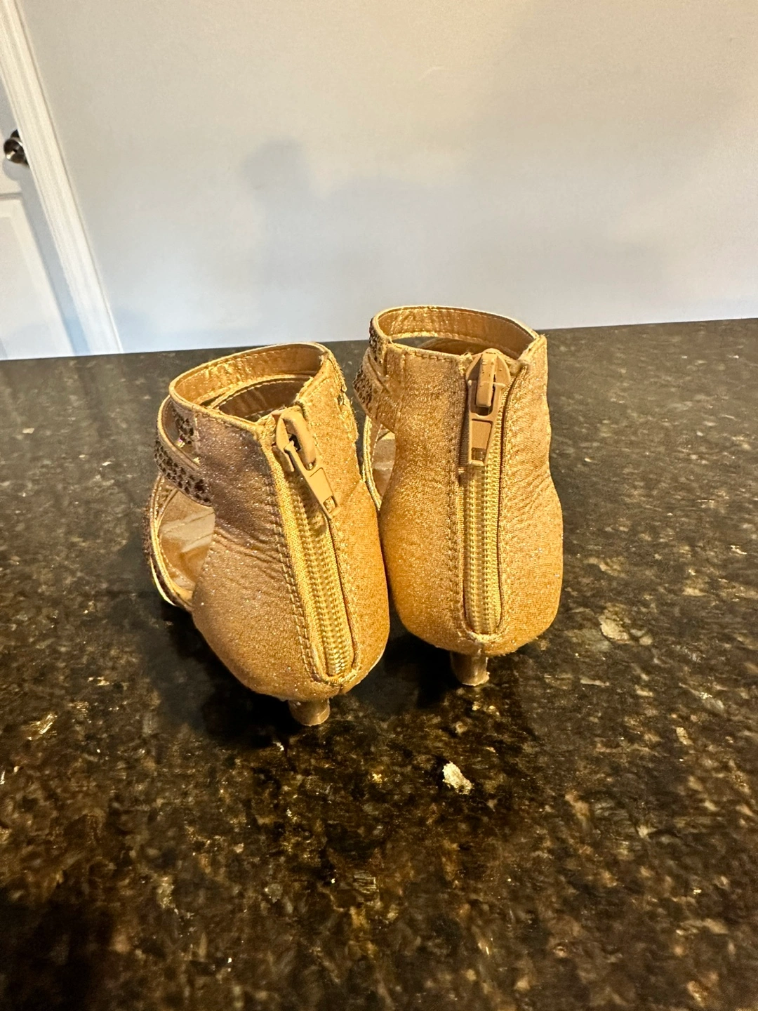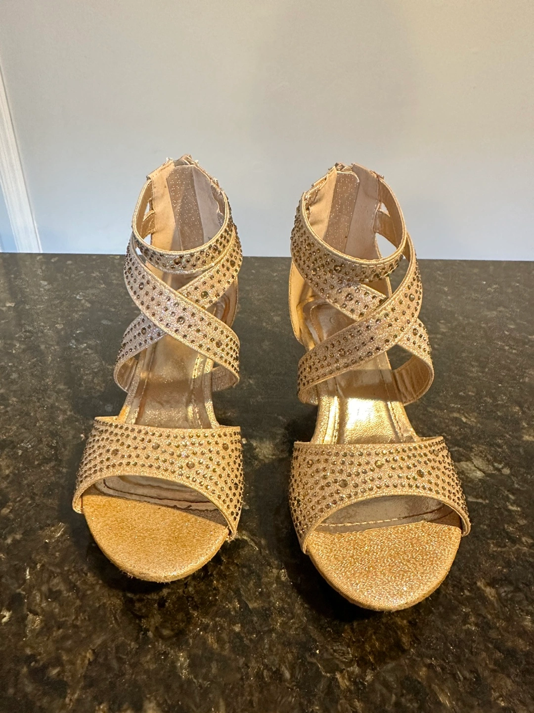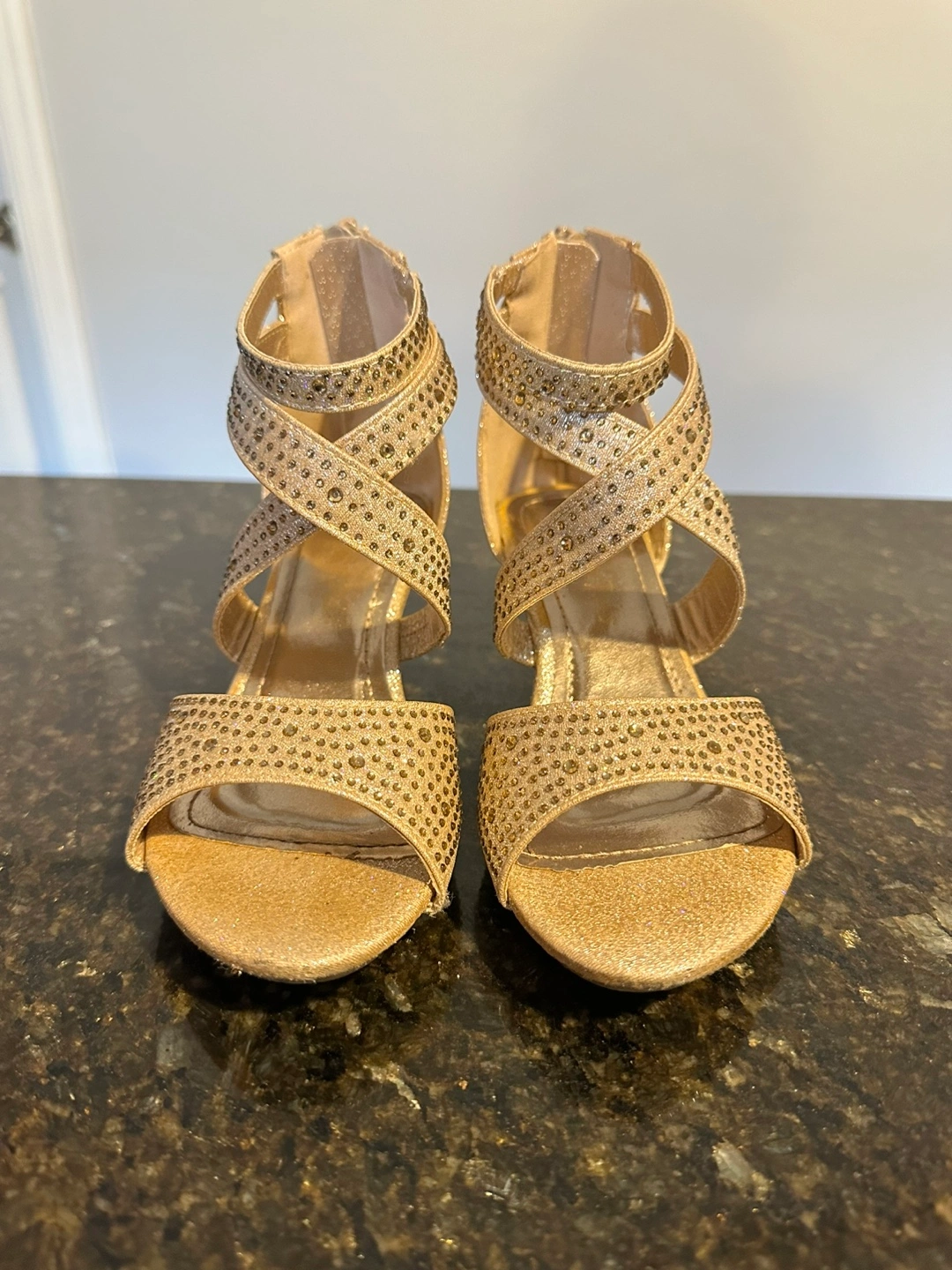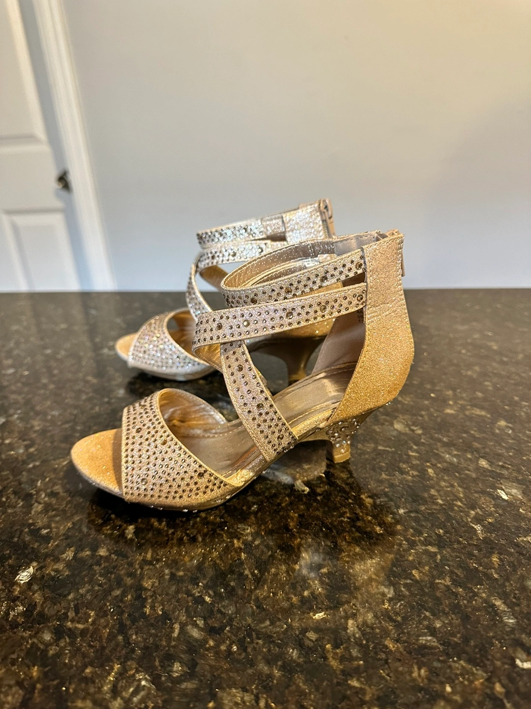 Gold glitter heels with rhinestone embellishments. Back zipper closure. Wedge heel.