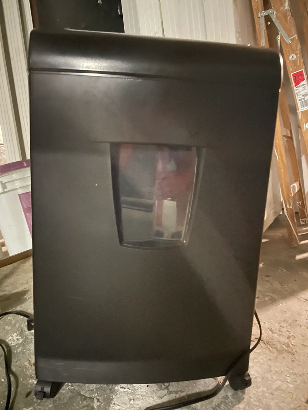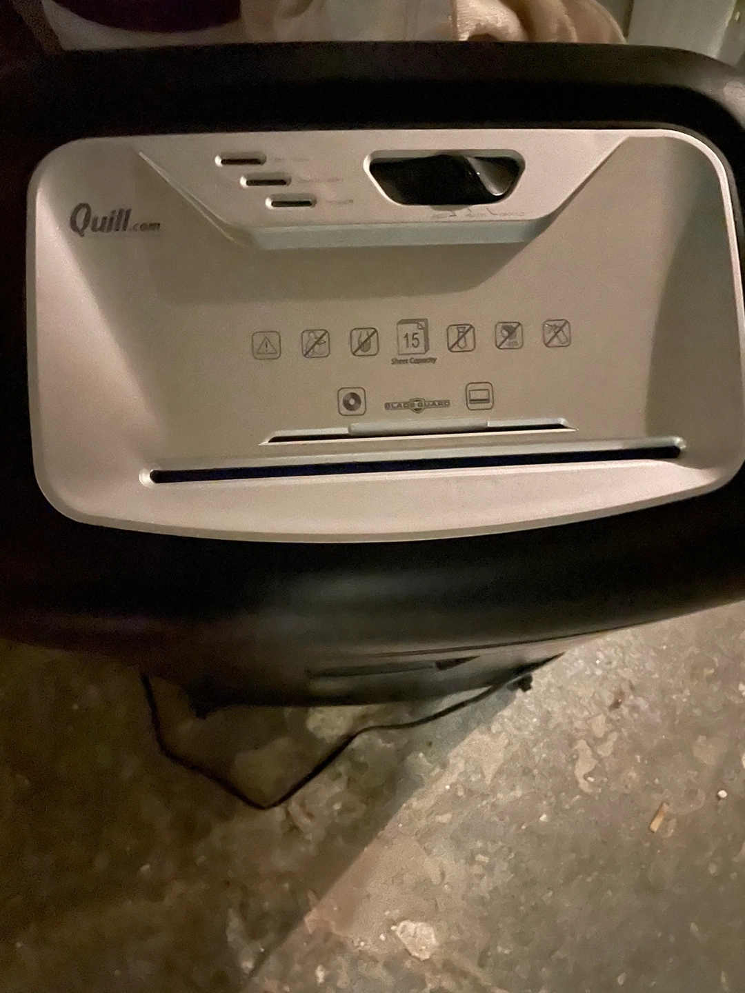 20Black paper shredder with a 15 sheet capacity. Has a bin for shredded paper and a safety feature to prevent injuries.