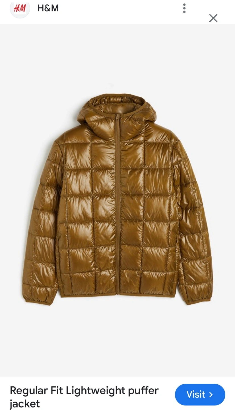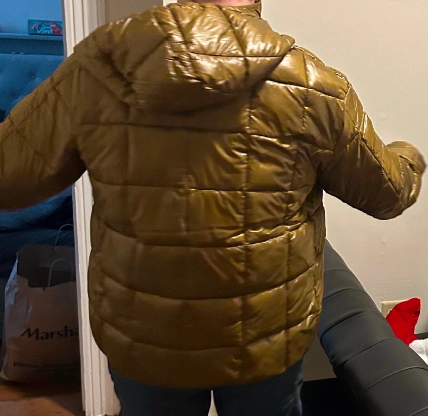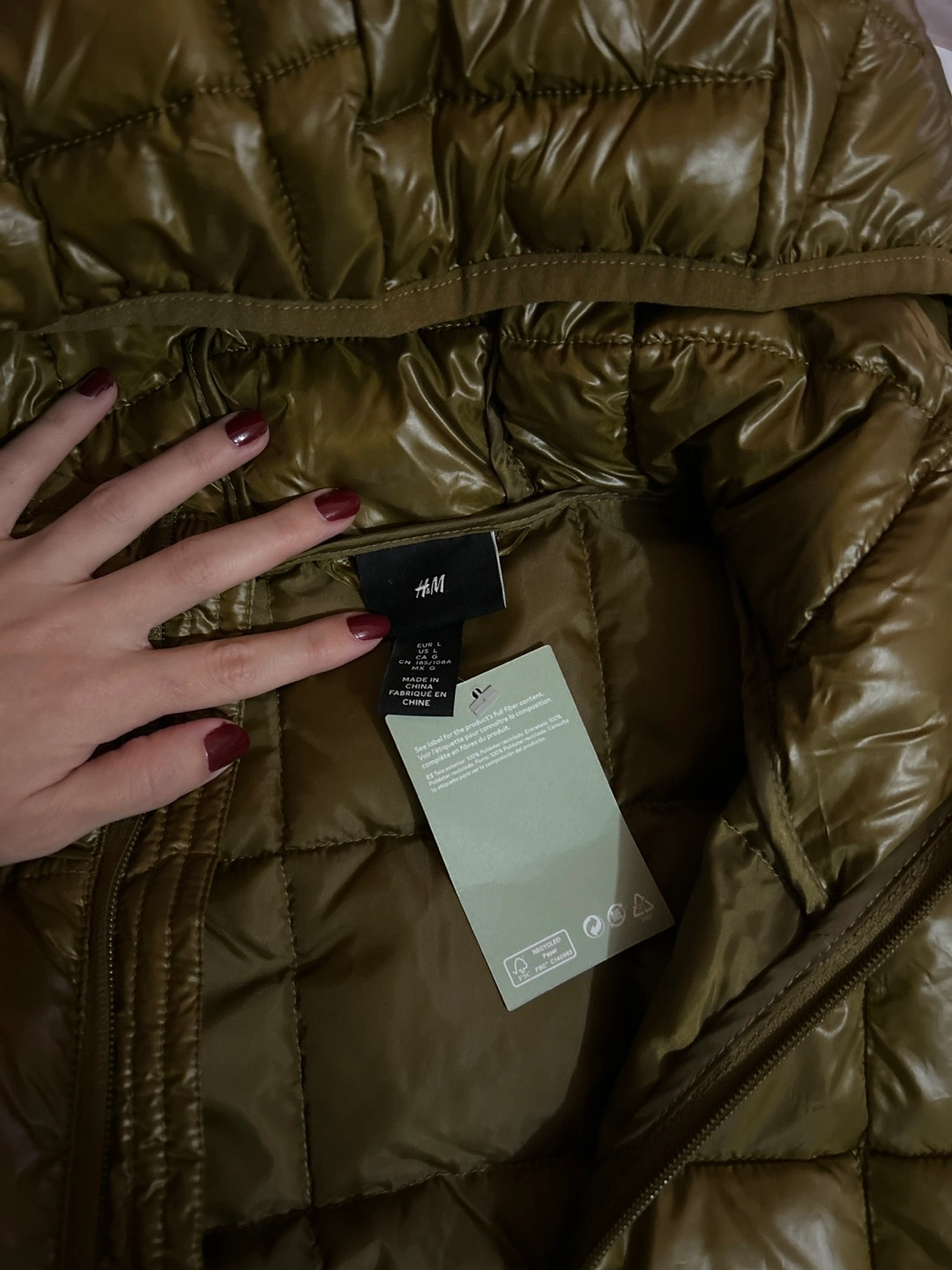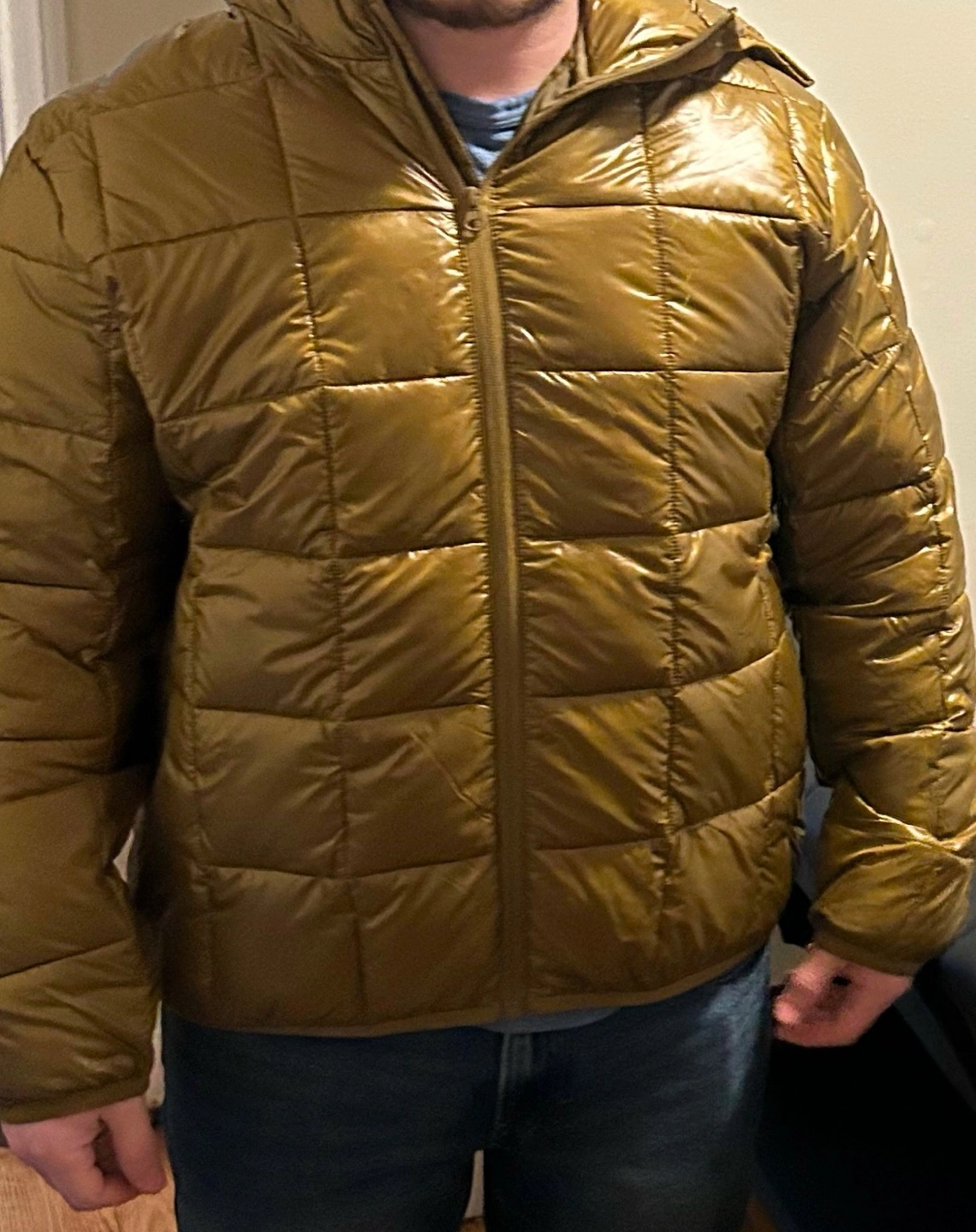 Lightweight puffer jacket with hood. Zipper closure. Green color. A gift to my husband he tried and fit him perfect but he didn’t like the color! I would say it’s perfect for men and women, I don’t use oversized clothes but if you like to, it’s great for you as well!