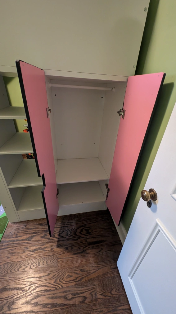 it originally came with pink doors, we then used it for our son and painted the exterior of the doors grey. the inside of the doors and drawers are still pink.