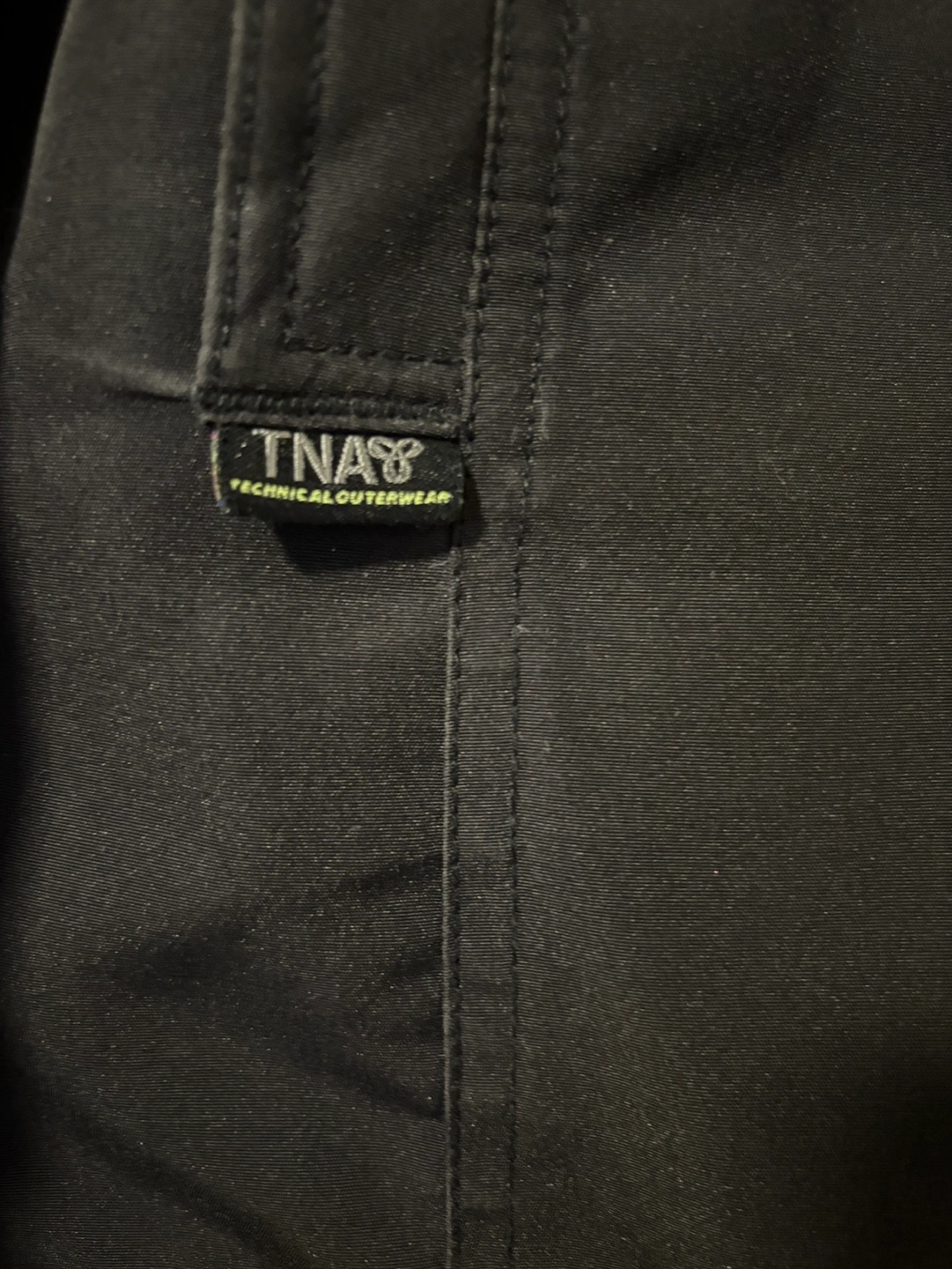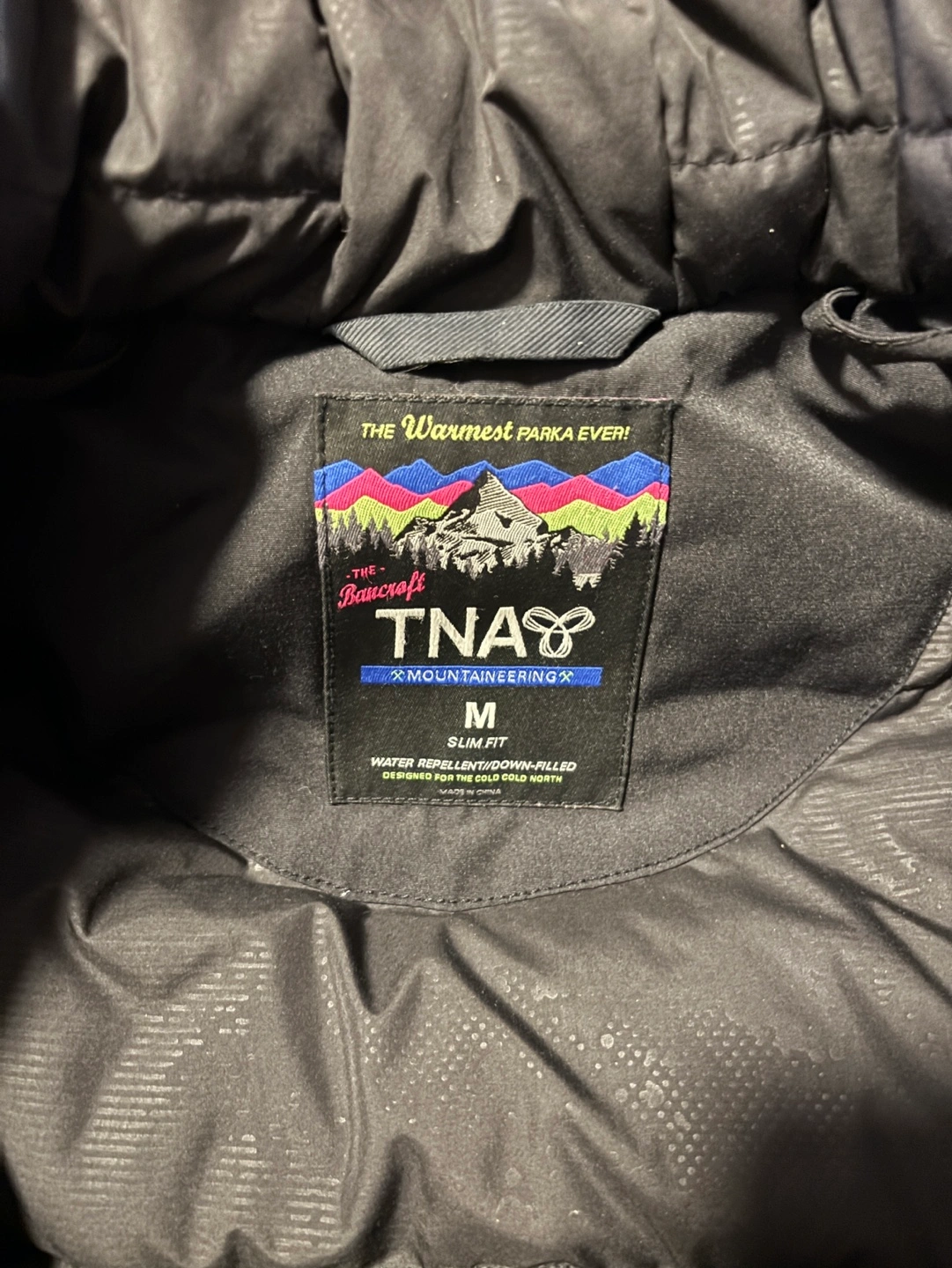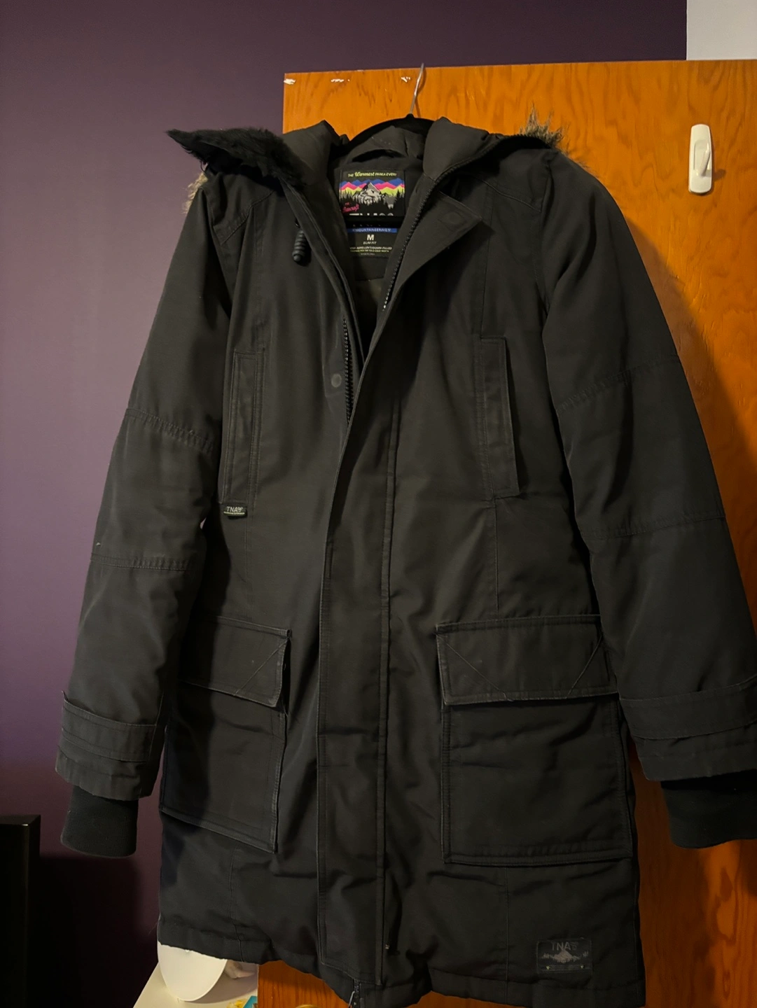 73Black parka with fur-lined hood. Size Medium. Water repellent and down-filled.