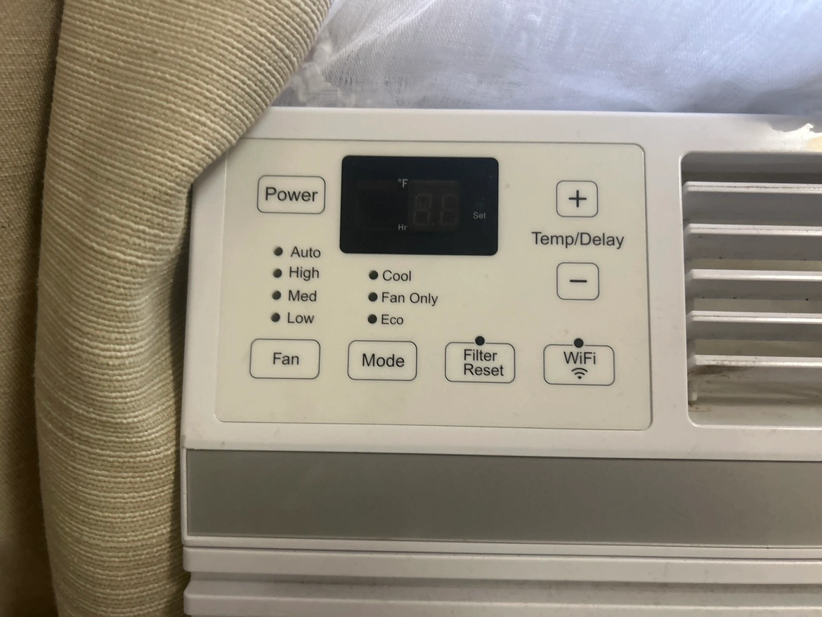 This window air conditioner is in good working condition. It is white, and has a remote control and Wi-Fi connectivity. The unit comes with a filter.