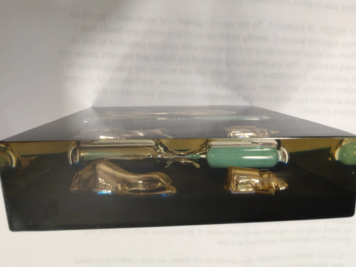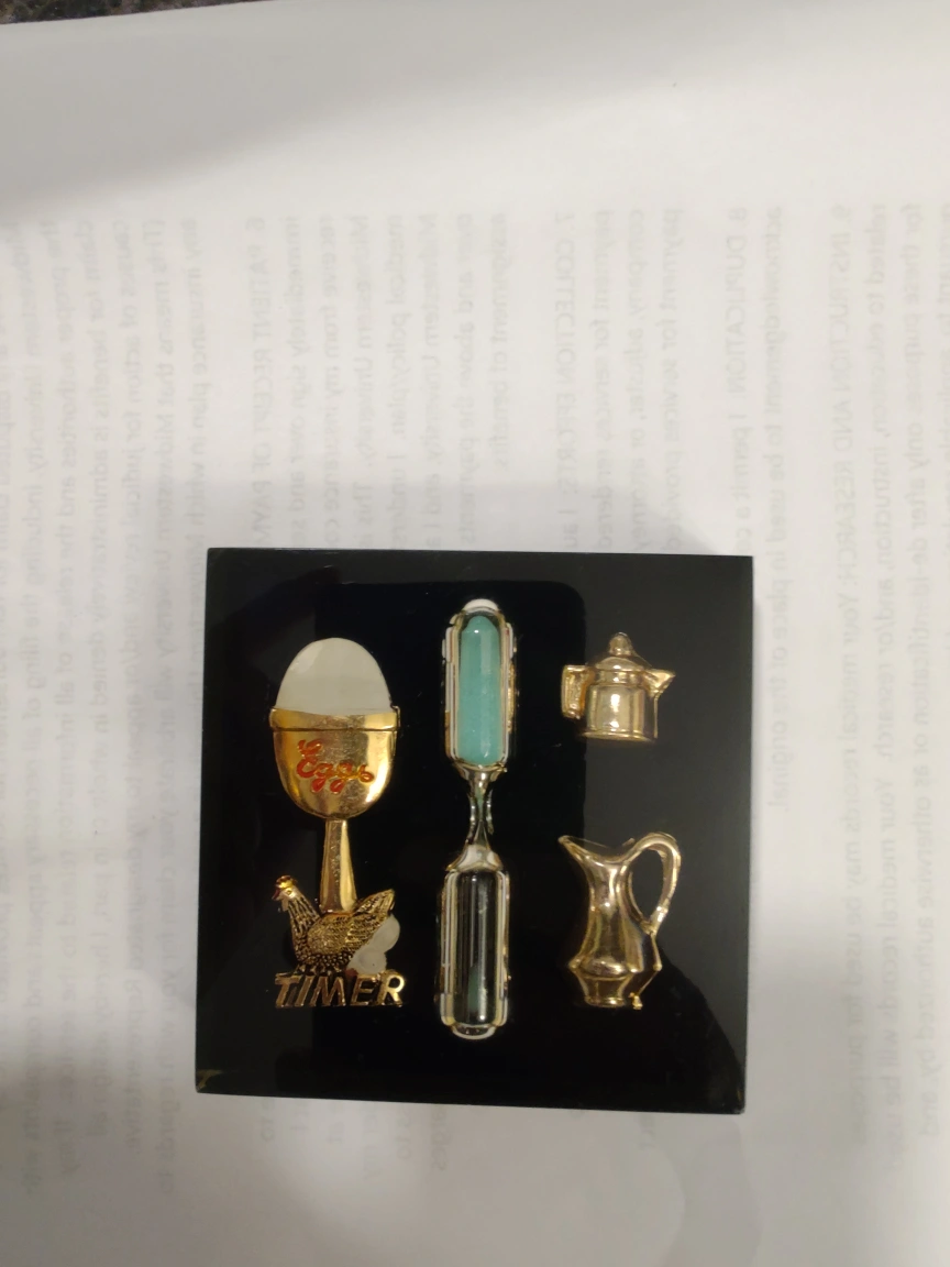 44Vintage egg timer, gold tone, comes with 3 settings. Has a black base with a clear top and glass hourglass. Includes the teapot, creamer, and egg spoon.