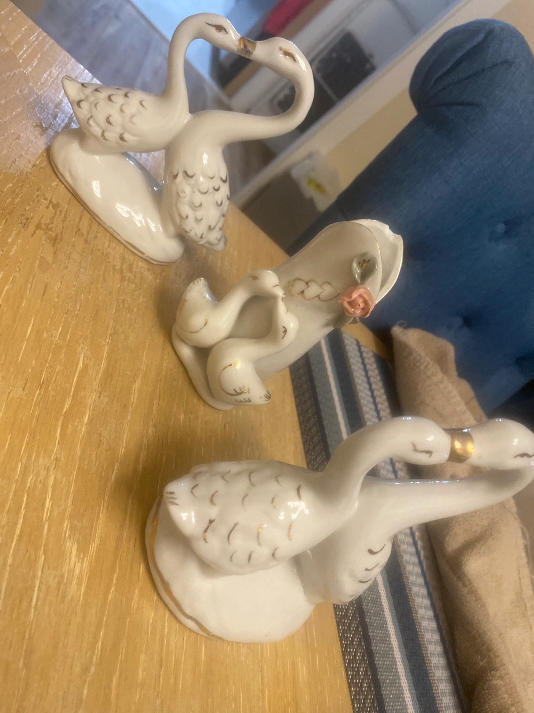 209Set of 3 porcelain swan figurines. Two swans are kissing and one has a baby swan under its wing. All are in good condition, except the baby swans has a slight chip.