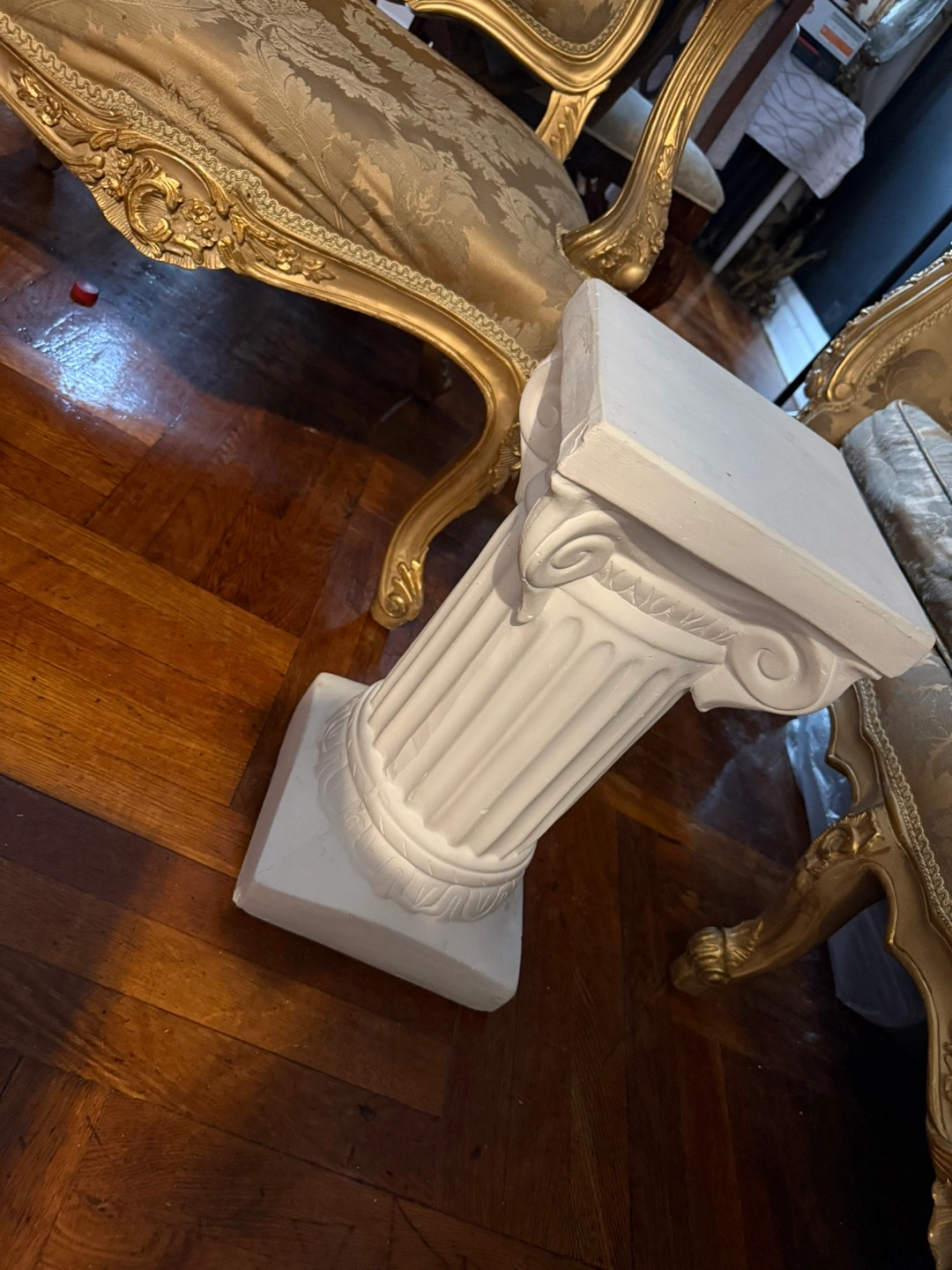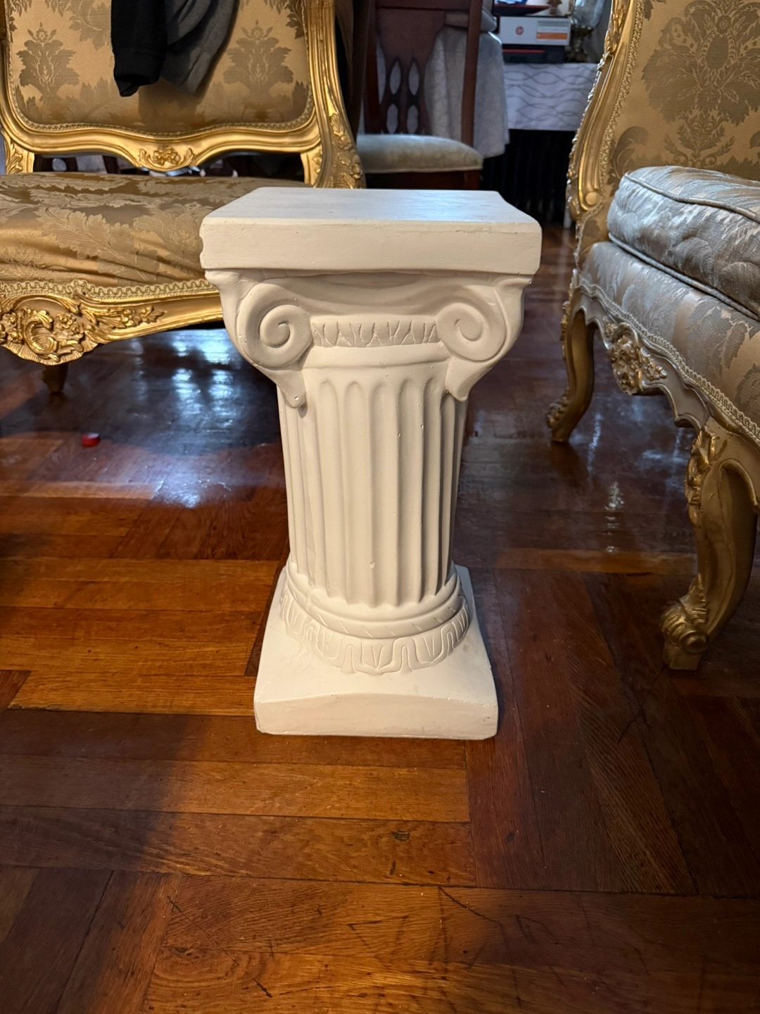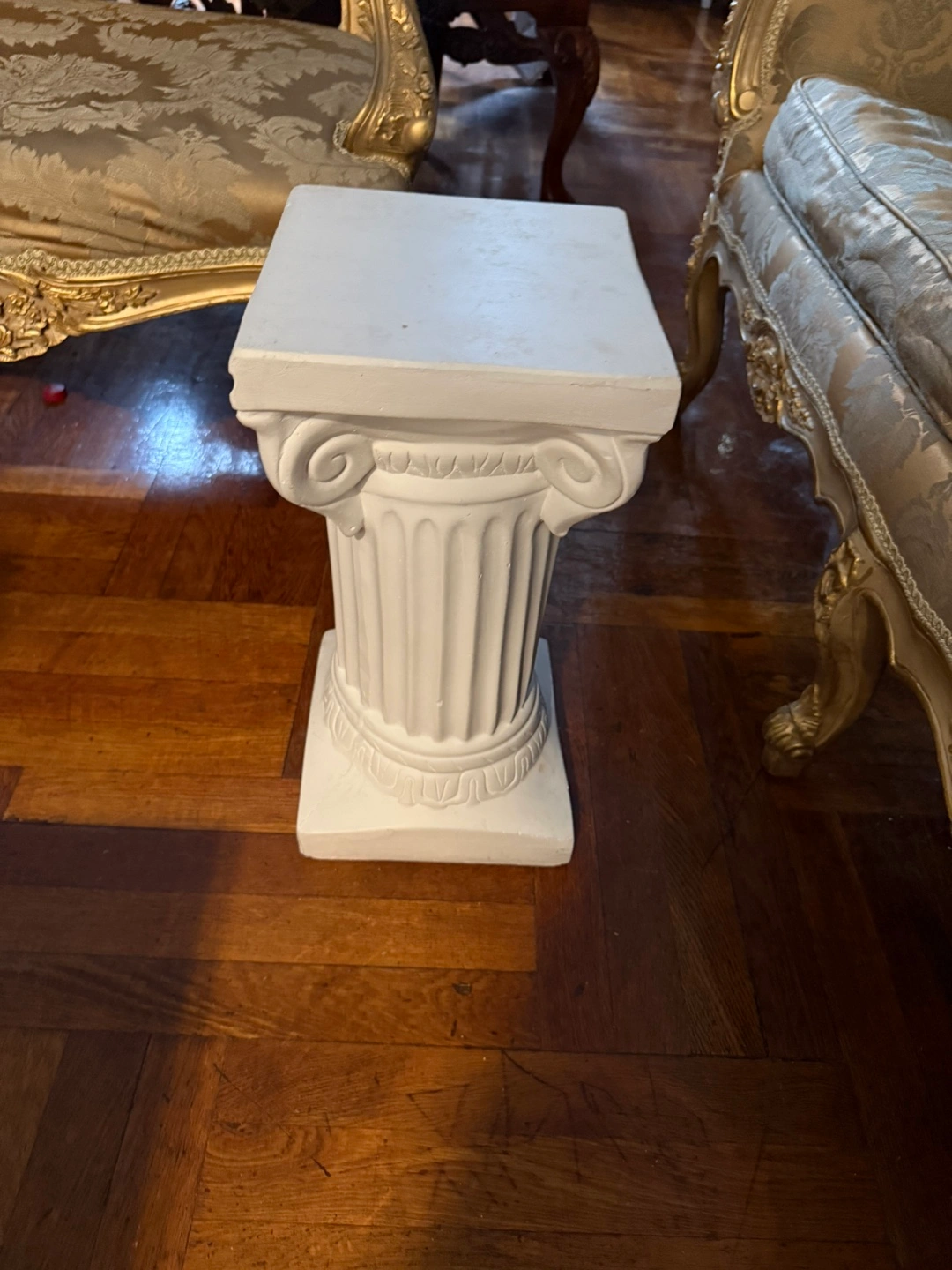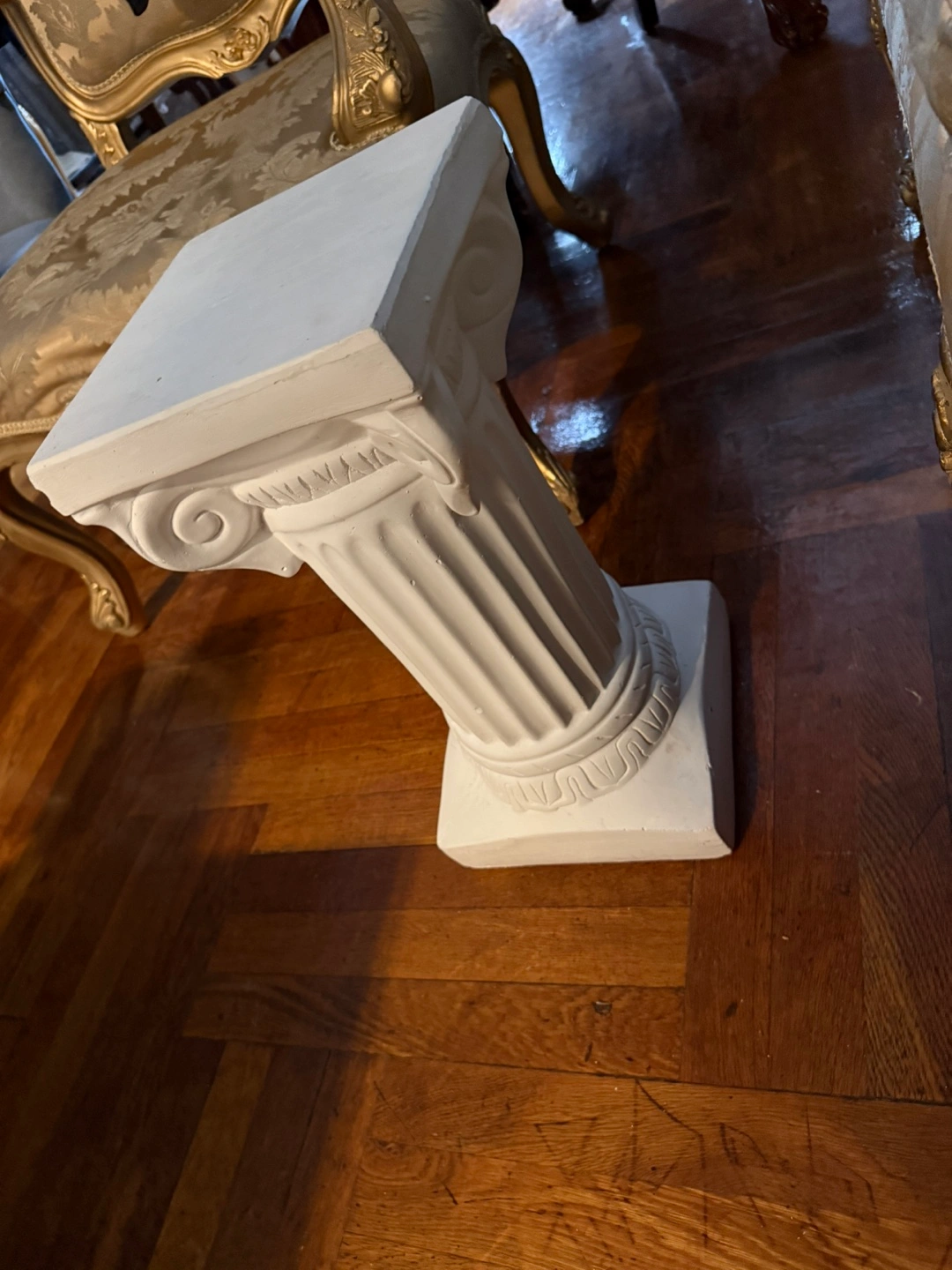 112White pedestal stand with a square top. Detailed design. Good conditions Pick up only 19 inches in height and 9 inches on every side
