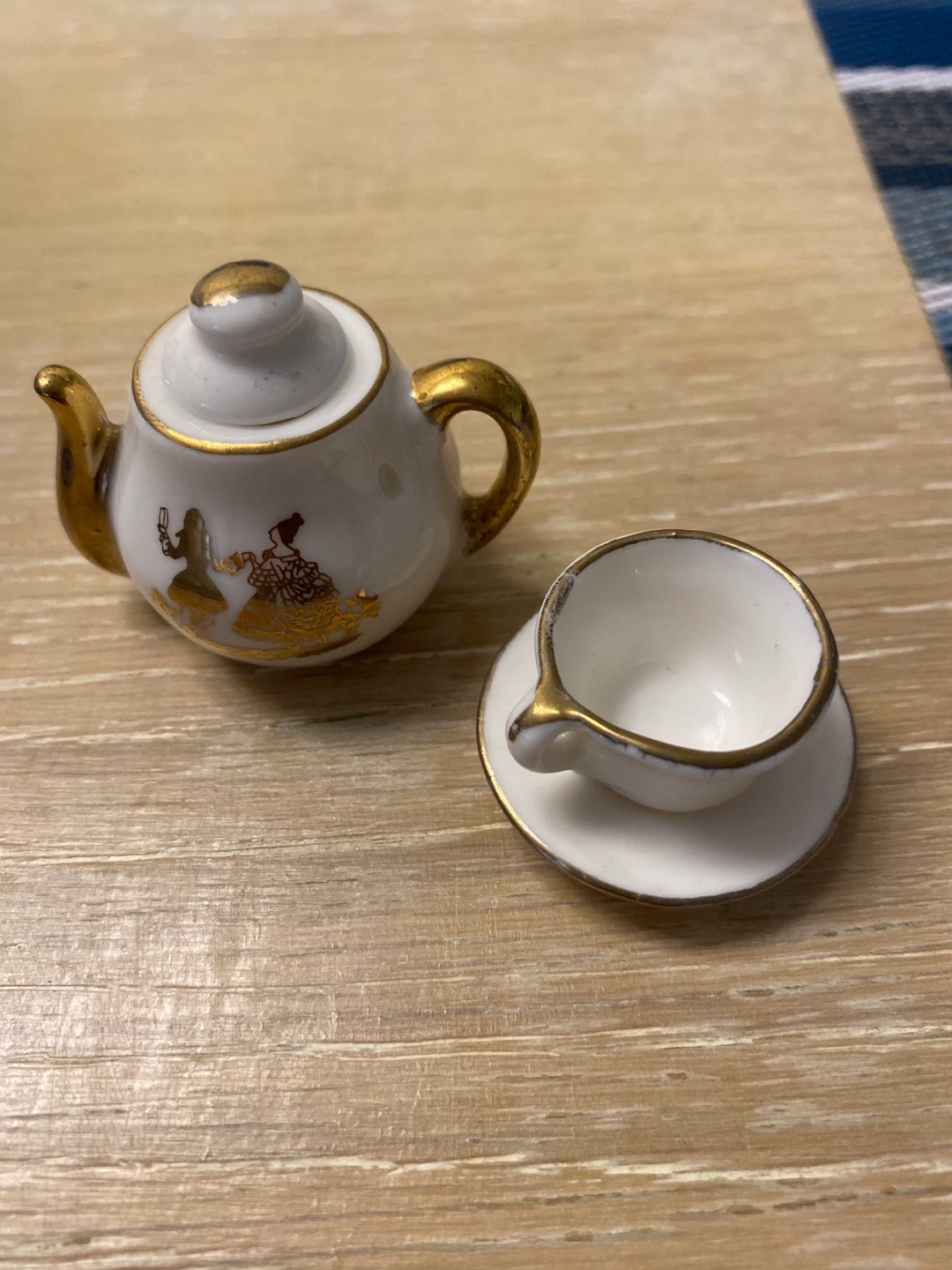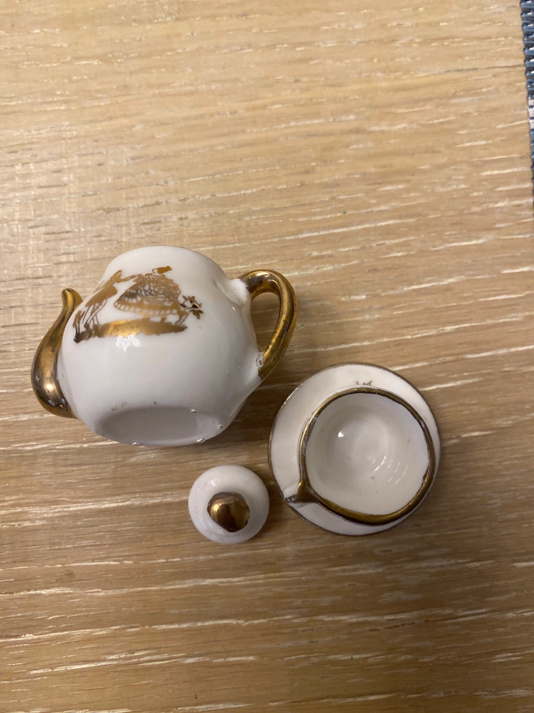 White porcelain tea set with gold accents. Includes a teapot, cup, and saucer. Small size.