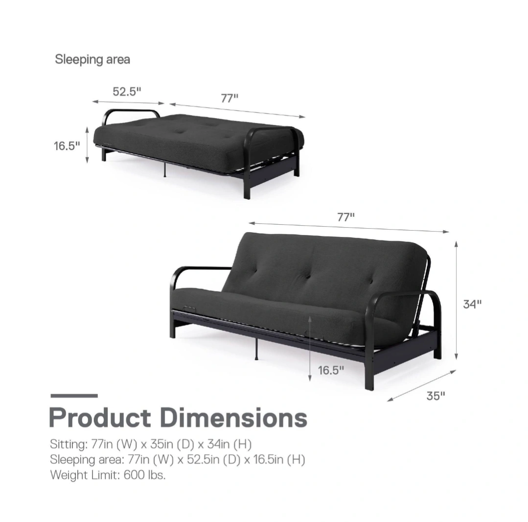 Mainstays Black Metal Arm Futon Frame with 6 inch Full Size Mattress & Retainer Covers