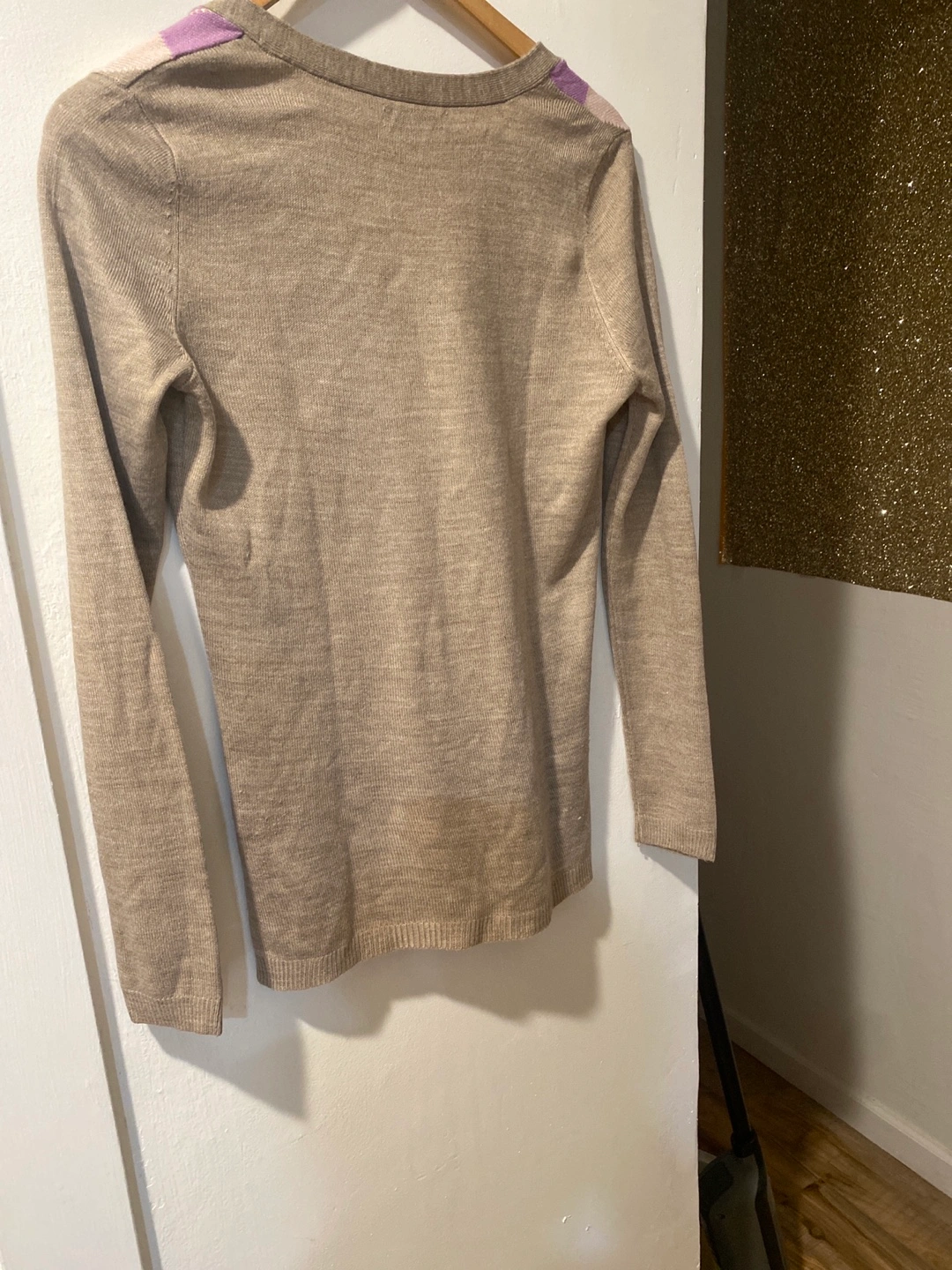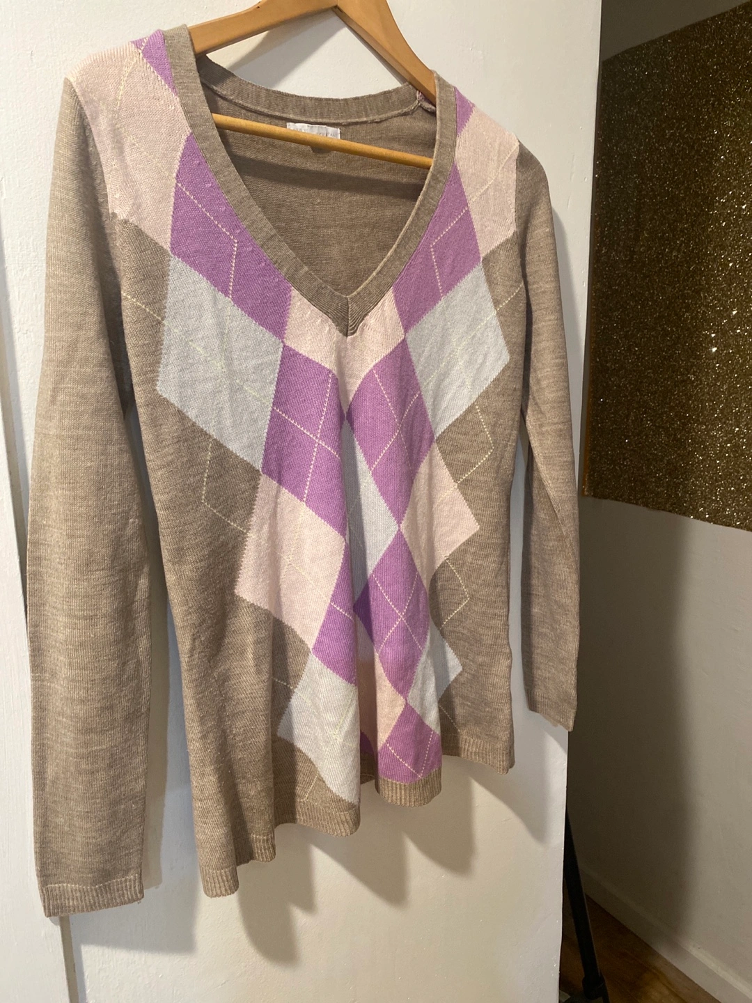 Long sleeve sweater with a V-neck and argyle pattern in purple, white, and pink. Size Small.