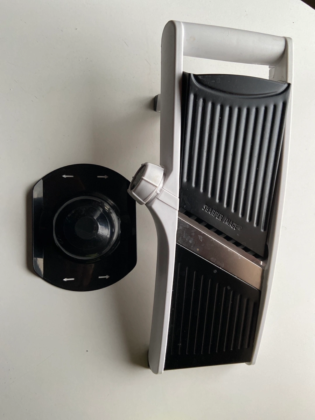 15Mandoline slicer with multiple slicing blades. Includes a safety guard.