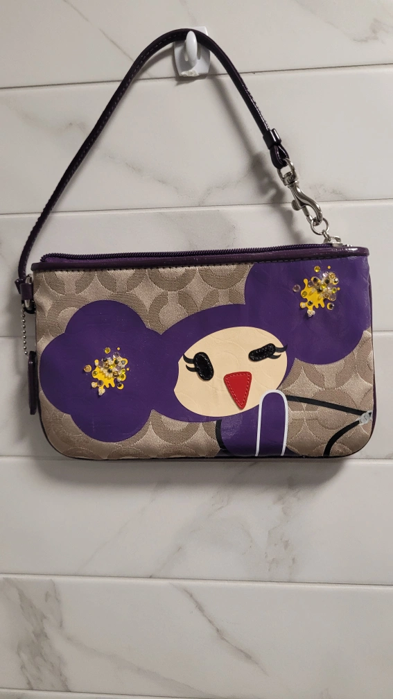 484Purple and beige wristlet with a cartoon face. The wristlet has a zipper closure and a small handle. It features a Coach signature pattern. A rare collector piece and in excellent condition. Authentic