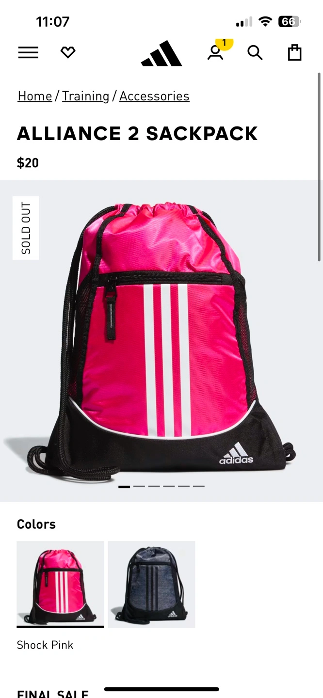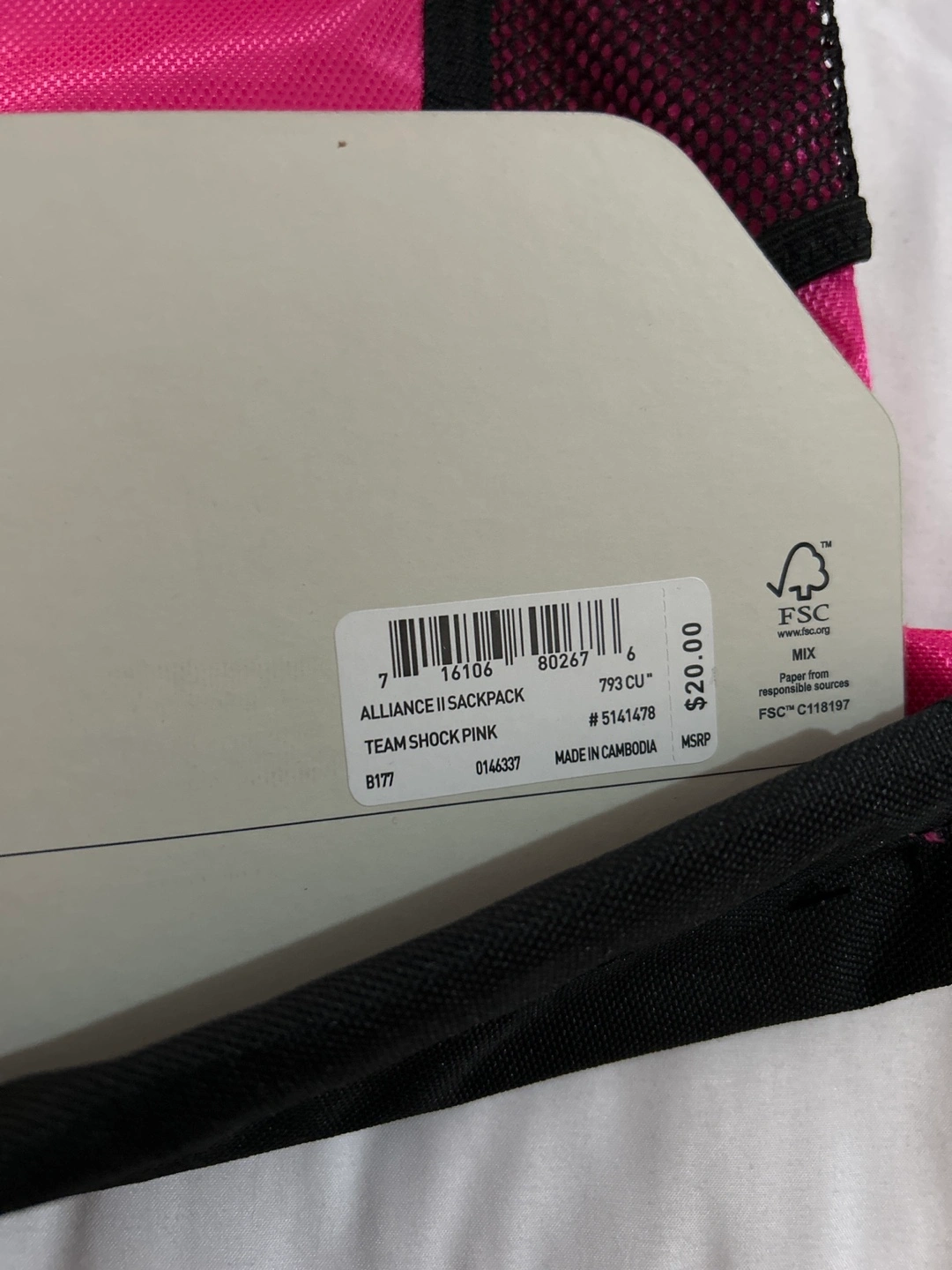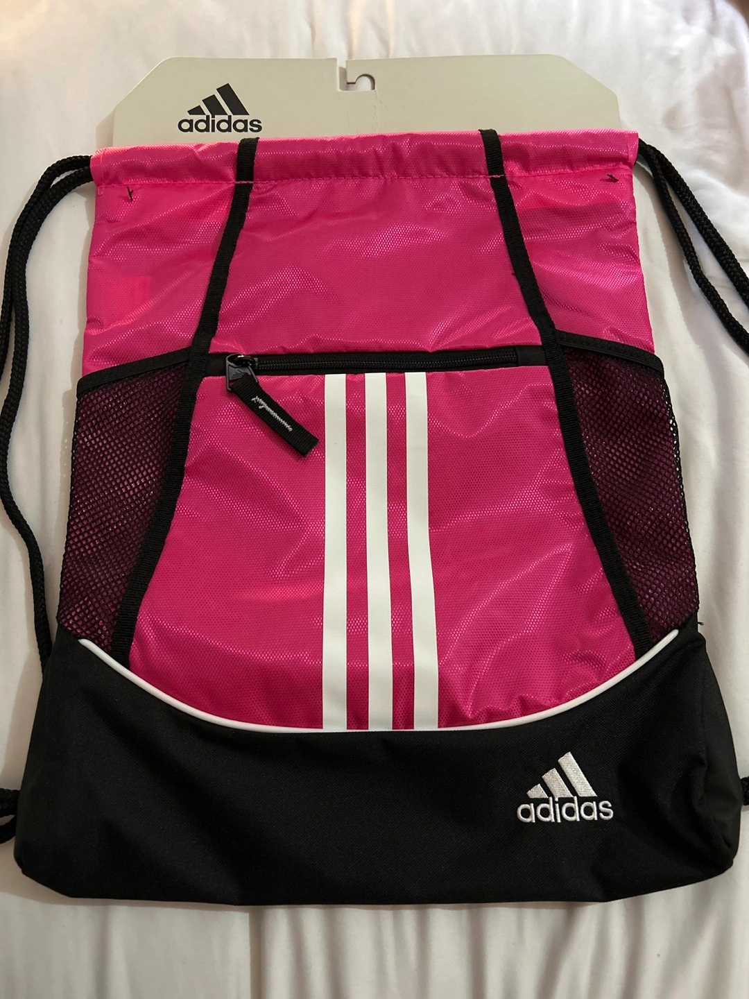Adidas Alliance II Backpack. Pink with white stripes. Has a small zippered pocket on the front. New with tags. It’s sold out now!! I paid for it $20 + taxes + delivery