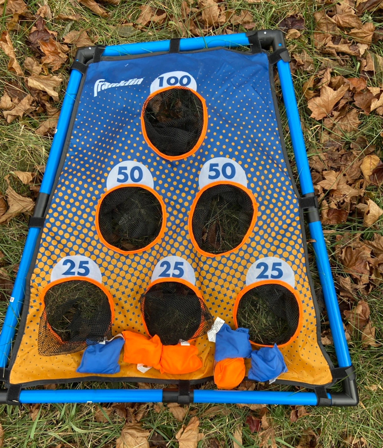 15Bean bag toss game with five target holes. The target holes are labeled with point values: 100, 50, 25, 25, and 25. The game includes bean bags.