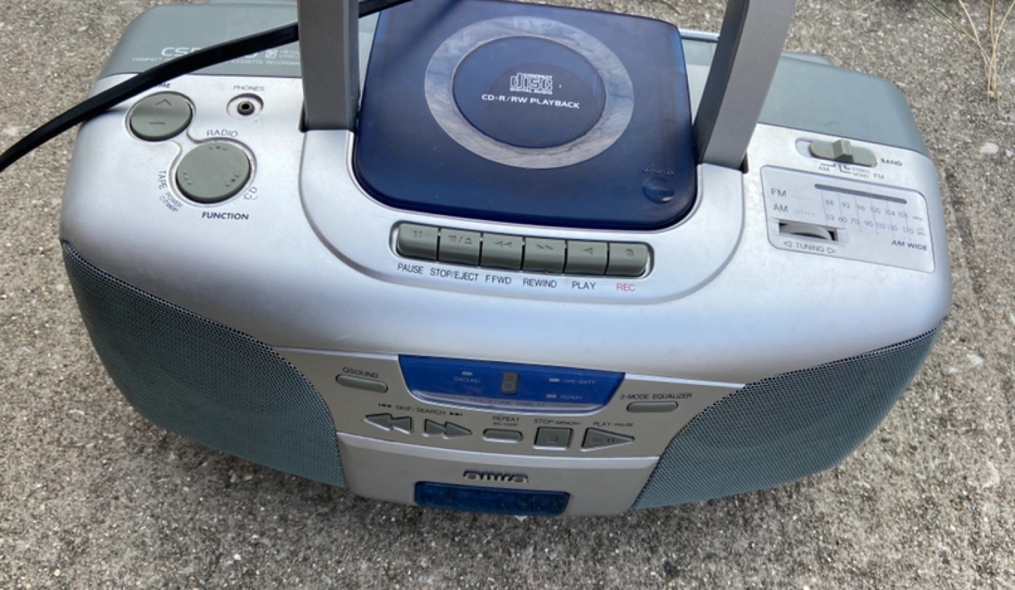 15Silver and blue boombox with CD player, radio, and cassette player. It has a handle on top, aux input for headphones, and a 3-mode equalizer.